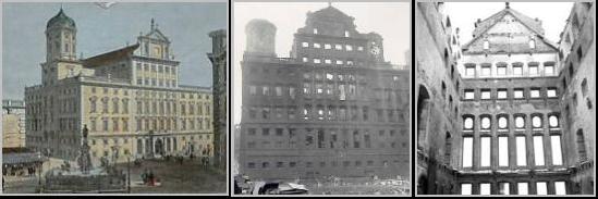 Above left: Augsburg Rathaus before and after British bombing. Right: Golden Seal hall, after |