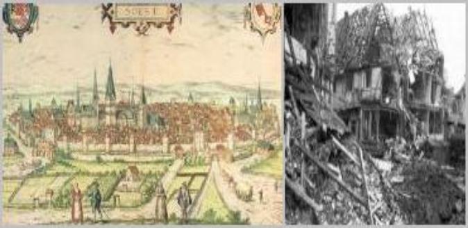 | Another ancient Hanseatic city with over a thousand years of history was Soest, and in the Middle Ages it was the second or third largest city in Germany. Mentioned in documents for the first time in the year 836, Soest belonged to an old chain of settlements existing from 600 AD. The town had a fruitful landscape, plentiful water and an existing salt spring which it profited from. A medieval Arab envoy reported in 972 of a populated place named "Shushet" where salt was made. In the 15th century, Soest came under the protection of Duke of Kleve Johann I., and it secured a great amount of independence. After the death of the last duke of Kleve in the year 1609, Soest was awarded to the House of Brandenburg as part of the Kleve inheritance. Soest suffered under the Thrirty Years War and by 1756 only had about 3,600 inhabitants. It lost the right of coining money in 1742, and languished since then. In the Second World War, Soest was the goal of 30 allied bomb attacks because of nearby train yards and a factory in town. A third of the city was completely destroyed, especially the old churches. 60% of the houses were damaged or destroyed. The ancient Patrokli cathedral, built between 954 and 1166, whose tower was once called the “tower of Westphalia” because it stood nearly 100 meters high, was bombed in a 1945 Good Friday attack and all but totally destroyed. |