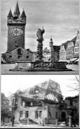 | Historically, the little Catholic town of Straubing in Bavaria lazes quietly on the right bank of the Danube, crossed by two bridges and crowned by a tall square tower with five pointed turrets dating from 1208. Today, the town has eight Catholic churches, one of which is St Peter's which houses the tomb of one Agnes Bernauer, a poor girl accused of withcraft long ago. Pretty, ancient Straubing was founded as a city in 1218 by Louis I Wittelsbach, Bavarian Duke. Straubingers heard their first alarm in 1941. Starting from 1943, it sounded almost daily. The first heavy air raid came on November 4, 1944 at noon, hitting the train station and railway tracks. More heavy attacks took place on December 20 and February 5, 1945. The worst day in Straubing history is considered April 18, 1945 at the tail end of the war. The bombing lasted 42 seconds, with 480.8 tons of high explosive bombs and 33.8 tons of incendiary bombs dropped to make it easy for the Americans who were poised to take the city. The town took 2 days to fight the fires and save people buried in cellars. Over 300 people perished, with many more later succumbing to injuries sustained from the attack. In 1952, the last broken down cellar was dug out, and 30 more bodies were found. There were at least 500 civilian fatalities as a result of the bombings. A quarter of all houses and buildings in the old part of town were completely destroyed or severely damaged. The town was in ninth place in degree of destruction in Bavaria, with Munich at eighth place. |