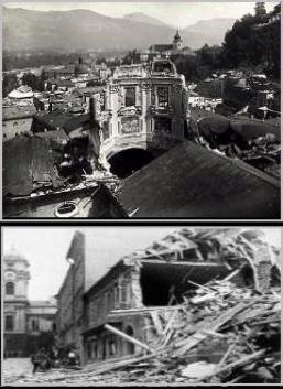 | Then there is the controversy over Mozart's death mask. According to legend, Count Joseph Deym von Stritetz made a plaster cast of Mozart's face upon his death and subsequently exhibited the death mask in his gallery/museum, placed on a wax figure dressed in fancy clothing. When the Count died in 1804, the mask went to his widow and upon her death in 1821 it vanished. Then, in 1947, a death mask turned up in an antique shop in Austria and ended up in the ownership of a sculptor named Willy Kauer who, thinking it looked like Mozart, tried to get the Austrian Ministry of Education to commission an inquiry in 1948 as to its authenticity. Although the mask had several features in common with Mozart, including pox marks, they released their findings as inconclusive in 1949. There was another investigation in 1950 and this time they decided that the mask was unlikely to be Mozart's and it was returned to Kauer. By 1956, the Mozarteum sponsored yet another examination of it and studied two initials inside it, seemingly from a bronze caster in Vienna who worked during Mozart's life named Thaddaus Ribola. He had a studio next to Count Deym's gallery during the 1790's. Still, not enough evidence to be sure. You decide from the pictures below (above). At the left is a recently discovered portrait. In the needless, last minute Allied bombing of the historic gem of Salzburg, virtually all of the old churches in the vicinity of the blasts lost their magnificent stained glass windows to the explosions. On the morning of May 4, 1945, tanks of the XV Corps 106th Cavalry Division rolled through Salzburg, a mere three days after it had again been hit hard by American bombers. 40 percent of Salzburg's buildings were inanely destroyed or damaged by Allied bombing. The dome was blown off of the famous, old Salzburg Cathedral which had witnessed so much history, above left right. The terror bombing raid also hit the house Mozart lived in for many years on Hannibalplatz, above, bottom right, and almost totally destroyed it on October 16, 1944. It was long ago called the Dancing Master's House "Tanzmeistersaal". Mozart lived there until his departure for Vienna in 1780. Nannerl lived there until her marriage in 1785, and Leopold remained in this house until his death in 1787. The Mozarts gave many private concerts here; The International Mozarteum Foundation purchased the surviving section of the ruins in 1955, left, and turned it into a museum and, with great effort, reproduced it close to the original. |