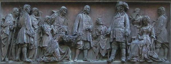Huguenots fled to Holland, Britain, Switzerland and South Africa. Considerable numbers of Huguenots migrated to North America, especially to Virginia, the Carolinas, Pennsylvania and New York. But in the direction of West and the North, the major site of transit was Frankfurt, Germany, and the main places that welcomed the refugees were Brandenburg-Prussia, Hesse-Cassel, the Rhine- Main region, the Electoral Palatinate and Franconia. From 1524 to 1740, there were 200 Huguenot colonies and nearly 44,000 Huguenots established in Germany, particularly in religiously tolerant Prussia where they were welcomed heartily by Elector Friedrich Wilhelm, as is represented in the picture at the left which shows the exiled Huguenots on their knees and bowing before Friedrich Wilhelm in gratitude, and in the relief on this page above, showing them in Berlin with the Prussian king. The French refugees, attracted by numerous privileges besides free practice of Calvinism, brought much capital into Prussia as well as 46 new crafts, for instance silk and other textile industries. They also introduced certain vegetables such as beans, asparagus, sweet peas and Brussels sprouts. In 1686, many persecuted French Huguenots went to the small city of Erlangen in Mittelfranken (Franconia) which today is part of Bavaria, and they outnumbered the German residents 1,000 to 317. After 1715, when peace treaties after the War of Spanish Succession precluded a return home, the refugee mentality changed to an immigrant mentality and the French influence subsequently declined. By 1750, the French had adopted the German language and culture as they gradually assimilated until, at the end of the 18th century, they were completely "German". In 1822, church services in the Huguenot church in Erlangen were held for the last time in French. Potsdam’s French Church (Französische Kirche) was erected in the 1750s for the Huguenot community there, but it was said there was a French church in almost every town in Prussia. In 1700, it was estimated that every third Berliner was French and a significant proportion of Prussia's population was French-speaking. The Berlin Huguenots preserved the French language in their church services for nearly a century until they, loyal to the land which had given them freedom, willingly shed it in protest of Napoleon's occupation of Prussia in 1806-07. Friedrich Wilhelm had succeeded in enrolling Huguenot 500 officers and 1,500 Huguenot petty officers and soldiers in his army, and the refugees continued to play an important part in the army of Brandenburg-Prussia where at times they made up than one-third of the officers. Later in history, General Hermann von François, the First World War hero of the Battle of Tannenberg and famed U- boat captain Lothar von Arnauld de la Perière both traced their ancestry to the Huguenot refugees. It was not until the Edict of Toleration in November, 1787, that the civil and religious rights of Huguenots in France were even partially restored. |