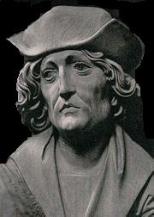 | Tilman Riemenschneider, outstanding German late Gothic sculptor, was born around 1460 in Heiligenstadt. His father was Master of the Mint in Osterode am Harz. He cut metal to make dies and translated designs into three dimensional form which later translated into sculpture. In 1483, young Riemanschneider entered a Würzburg workshop as a journeyman and was soon admitted into Saint Luke's brotherhood where he became a full fledged figural artist. In 1485, he married and was made a citizen of Würzburg and became a master. In contrast to the idealized forms of the past, he chose to represent men and women as the eye naturally sees them. self portrait, above Artistically ahead of his time, he used light and the natural beauty of wood, eliminating the application of color, and he also worked in stone. His workshop had as many as eighteen apprentices carving for him. His first documented work was the altar for the Münnerstadt parish church (1490–92), which was later dismantled. He had a continuous flow of commissions; his major work, the “Altar of the Virgin” (c. 1505–10) in Herrgotts Church at Creglingen was a 32 foot high wood altar depicting the life of Mary. He employed assistants on the massive monument, but he executed the figures himself. Other major works are “Adam and Eve”, stone figures from the Würzburg Lady Chapel, the “Altar of the Holy Blood” (1501–05) in St. Jakob, Rothenburg and the “Tomb of Henry II and Kunigunde” (1499–1513) in Bamberg Cathedral. His finest masterpieces were the altars in Muennerstadt, Rothenburg and Creglingen. His figures were for the most part meant to be seen from below by worshipers so that what appears to be disproportion was actually done with that uplooking perspective in mind, much in the way that the heads of Greek sculptures were deliberately enlarged in order that they look normal when the statue is displayed on columns. He carved for the enjoyment of ordinary people. Riemenschneider was successful and popular, unlike his contemporary Veit Stoss, a rebellious German artist often in trouble with the law. Stoss, brilliant sculptor, engraver and painter, was one of the first artists from Northern Europe who was compared with Italian Renaissance artists. His dramatic work reflected his dramatic life. Stoss moved from Nürnberg to various places including Cracow in 1477 and lived there until his return in 1496 with his wife and eight children. In Nürnberg, he worked on wood carved altars, groups and figures. In 1503, it is said that he violated some law and was by some accounts sentenced to death, but his sentence was commuted at the last moment because of his amazing skill, and instead he was branded on both cheeks with a red-hot poker. Among other pursuits, he painted works by Tilman Riemenschneider. In 1506, he was apparently arrested again but pardoned by the Emperor. Riemenschneider was, in contrast, a pillar of the community and he became Mayor and Alderman of Würzburg, but during the unsuccessful peasant revolt of 1525, as one of the councilmen who refused to support the use of force against the rebels, he was seen as siding with the peasants against the Prince-Bishop and he was imprisoned and tortured. When eventually released, his hands were said to have been hopelessly injured and his spirit broken. He could no longer work and passed away on July 07, 1531. Two of his sons, Jörg and Hans, were sculptors, and two others, Bartholomeus (a pupil of Dürer) and Tilman, were painters. Allied bombs in World War Two destroyed some of Riemenschneider's masterpieces, as well as those of Stoss. |