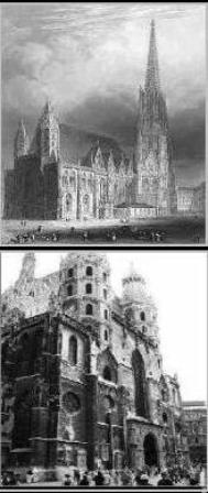 | St Stephen's Cathedral, built in the 14th and 15th centuries, escaped Allied bombing until the final days of war when it was at last destroyed. The church was set on fire on April 11, 1945, burning the entire wood roof-truss of the nave. When the vaulting collapsed, the Gothic choir stalls were buried. On April 12, a 22 ton bomb struck the floor of the church. Only the clapper of the bell remained intact.. |