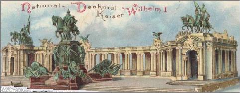 There were monuments to Kaiser Wilhelm I of Prussia all over the land. In March, 1888, fifteen days after the death of the Kaiser Wilhelm I of Prussia, who was proclaimed German Emperor in Versailles in 1871, the Imperial Diet unanimously voted to erect a memorial to the memory of the much respected and beloved founder of the German empire. In June of 1894, construction began at a cost of four million gold marks. The number of animals on the monument prompted many contemporary jokes. It included a menagerie of 157 animals: 21 horses, 2 oxen, 8 sheep, 4 lions, 16 bats, 6 mice, 10 pigeons, 2 ravens, 2 eagles, 16 owls,1 Kingfisher, 32 lizards, 18 snakes, 1 carp, 1 frog and 16 crabs. The center of the magnificent 21-meter high monument was the 9-meter-high equestrian statue of the Emperor accompanied by a female god of peace. Victory goddesses floated on the four corners of the bronze pedestal and the floor of the hall was covered with a beautiful mosaic floor. On the ledge of the front, four characters groups sculpted by various artists embodied the kingdoms of Prussia, Bavaria, Saxony and Wuerttemberg. The four groups on the reverse side were trade and shipping, art, science and agriculture and commercial diligence. Ceremonies took place all over Germany in March of 1897. Later, on March 22,1900, Kaiser Wilhelm II, his wife, and rulers or representatives of all the German States dedicated the new monument in Berlin. There was immense popular enthusiasm. The monument was built with a throne and red carpeted staircases, complete with a magnificent canopy edged in golden braids which was reserved for the dowager Empress ( the daughter of Queen Victoria of England and mother to Kaiser Wilhelm II ), the Prussian princesses and German rulers. A hundred Prussian and imperial deputies stood on the platform of the memorial among brilliantly uniformed officers. The Kaiser and his aides-de-camp and generals rode along of the troop line in the Unter den Linden to the tunes of military marches. When the empresses appeared in the imperial pavilion, the Kaiser gave the command for the drums and trumpets to play and for the singing of the favorite hymn of Wilhelm II: "Wir treten zum Beten von Gott dem Gerechten" (We are going to pray God the Just). A Lutheran pastor issued a prayer of consecration for the sixty-five foot monument and when he was finished the Kaiser drew his sword, made troops present arms, and cut the veil covering the statue while they all saluted. The statue, in bronze, represented Wilhelm I in full Prussian dress with a spiked-helmet. "To Wilhelm the Great, King of Prussia, 1861-1888 " was inscribed upon the monument along with: "Acknowledgement and faithful affection - the German people". The Kaiser remained on horseback for a time after the veil had been removed, while drums were beating, troops were cheering and military music playing "Heil dir im Siegerkranz". At the same time, a hundred and one cannon-shots was fired and all city bells rang out in pride. Afterward, there was a lush banquet where Kaiser Wilhelm II made a speech praising his father and recalling the suffering of Germany beforehand while under the French yoke. |