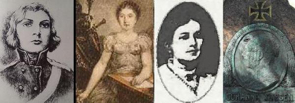 Eleonore Prochaska (1785–1813), daughter of an officer in the Prussian guards, was sent by her father to the military orphanage in Potsdam when her mother died. There, she later found work as a house maid. The war against Napoleon so inspired her that she disguised herself as a man and registered for first Jägerbataillon of the Lützow Free Corps under the name August Renz, and served as a drummer and then as an infantryman. She was severely wounded at the Battle of the Göhrde and field-surgeons treating her wounds discovered she was a woman. She was taken to Dannenberg, where she died of her wounds three weeks later. Anna Lühring (1796-1866) was inspired by the death of Eleonore Prochaska. The daughter of a craftsman in Bremen, she also disguised herself as a man and in February 1814 joined the Lützow Free Corps under the name Eduard Kruse. She participated in the siege of Jülich and other battles. Although her true identity was discovered, she remained in the unit until its return to Berlin and was honored for her services. She later married Karl Lucks and died alone and poor in 1866. (Sophie Dorothea) Friederike Krüger, alias August Lübeck or Auguste Krüger (1789-1848) also disguised herself as a man and became a soldier in the Prussian army. She served during the Napoleonic Wars from 1813 to 1815 in the first company of the Kolbergsches Infanterieregiment . Even after being discovered a woman, she remained in the army and was promoted to corporal after the Battle of Möckern. She married at war's end had four children. She was awarded the Iron Cross by Firedrich Wilhelm III of Prussia for her bravery. On her death, she was buried in the St.-Georgen- Friedhof in Templin, where her grave can still be seen. Johanna Stegen (1793-1842) did not disguise herself but was considered also a heroine during the Napoleonic Wars. On April 2, 1813, German troops fought Napoleonic troops near Lüneburg where in the course of the battle, the Prussian regiment risked running out of ammunition and Johanna rushed ammunition to them in her apron, contributing significantly to the Prussian victory. She was glorified soon afterwards in the patriotic poems of Friedrich Rückert. In 1817, she married a Prussian corporal. In her memory war monument was erected in Lüneburg, and once a year a young woman dresses up as Johanna and tells her story. Top: Eleonore, Anna, Friederike and Johanna |