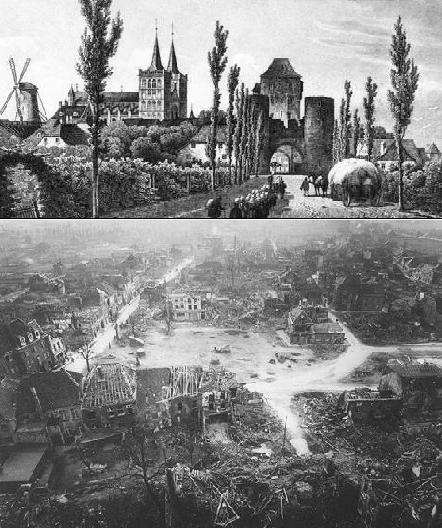 | In February, 1945, bombardment of the city began. Especially heavy bombing of February 10 and 13 killed almost 300 civilians and 18 foreign workers. The bombing destroyed large parts of Xanten. The ancient cathedral was nearly destroyed as was the medieval town center along with 85% of the town. in the Xanten town cemetery lie among the rest of the victims, the remains of ten members of one family. It was then occupied by British troops who evacuated the population elsewhere until Germany was defeated for good and fully occupied. After the war, many refugees from East Prussia found refuge here. |