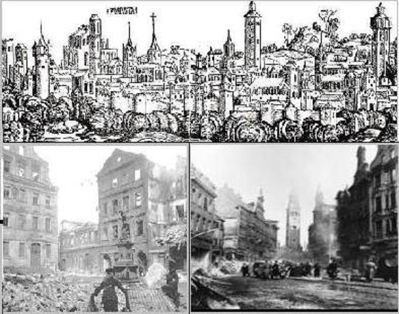 Above left: Augsburg Rathaus before and after British bombing. Right: Golden Seal hall, after |