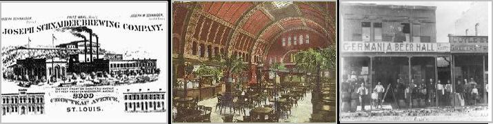 Brewing in ancient Germania was done by the women who germinated wheat grains and flavored their beer with myrtle, ash leaves and oak bark. Tacitus reports that the Germans drank beer out of auroch horns while lying comfortably on bearskin coats. After the 7th century, monks began to brew beer as a kind of "liquid bread" allowed during fasting days of Lent. This beer was especially strong and nourishing. Soon, they began to sell their beer in their monastery taverns, and many monasteries in Germania, Gallia and Britain become rich and famous. Monks soon had competition. Private northern German breweries were taking their own beer to Flanders and Sweden by 1200 AD. There were over 600 such breweries in Hamburg alone in the 1500’s. Monarchs liked the private brewers, as unlike monks, they had to pay taxes. Soon, royalty got into the act of promoting suds. Beer was still made by the women in their household until the middle ages. A common breakfast treat was warm beer enriched with eggs, ginger and nutmeg. The monks soon discovered hops as an appropriate spice for their beer. Although hops add a sour, bitter taste, they helped to keep it fresh longer and were thought to have a calming effect to reduce the danger of caving in to the devil's sexual temptations. Hildegard von Bingen recommended in her 12th century book that “One should drink beer!” and she prescribed it for depression and sleeplessness. At the end of the 15th century, there were numerous breweries in cities such as Salzburg, usually in combination with an inn. This is thanks in part to the famous physician 'Paracelsus' (Theophrast von Hohenheim, 1493 – 1541) who spent much of his life in Salzburg and discovered that beer was good medicine. Paracelsus replaced speculative doctrines with observations of nature, including the beneficial effects of beer. People were happily in agreement with his theory. A brewer of the day not only brewed beer, he butchered his own meat and hosted guests to enjoy the hospitality. Townsfolk passing by would have a drink of beer and carry some home in jugs. Soon, twelve major breweries dominated Salzburg, and there were more than a hundred individual brewers. "Beer gardens" grew up when brewers planted trees atop their cellars to keep the beer below cold as it fermented. Brewing was risky business in the middle ages, and those eager for greater profit often used cheap filler ingredients to pad the beverage, from fruit, herbs and eggs to tree bark and fish bladders. As a result, beer was sometimes putrid tasting and even poisonous. This gave urgency for some sort of uniformity law. The first regulation appeared in Augsburg, Bavaria in the 1480's. Bavaria's reigning Duke Wilhelm IV expanded the Augsburg regulation to cover all of Bavaria and it became official at Ingolstadt in 1516. The Reinheitsgebot, or the German (or Bavarian) Beer Purity Law was a regulation governing beer production in Germany which in its original text decreed that the only ingredients which could be used in beer production were beer were water, barley, and hops (it was later revised to allow yeast). It also set the price of beer. The penalty for making impure beer was also set: a brewer using other ingredients for his beer could have the barrels confiscated without compensation. 16th century Brewers in Bavaria have generally received the credit for having originated or at least modified beer to its modern form. German brewers in the United States took their profession just as seriously as those in the homeland. As the German population in America grew in more cities, small taverns gave way to the German style beer hall or beer garden and they soon became very popular for family entertainment which usually lasted from sunup to sundown, and they were absolutely shocking to people not accustomed to such frolic. The whole idea of leisure time was in fact a German import. Many beer gardens and halls not only offered fun, they served free lunches to entice customers, and lavish buffets depending on local food sources, usually with rye breads, sausages, herring, cheeses, spicy brown mustard and garnishes. By 1860, US commercial brewers reached a national production record of a million barrels and German style Lager beer was king. The beer was from local breweries. Beer halls were an integral part of German American life, and helped keep the culture intact while providing hours of entertainment and fun, with music, dancing, sports, family activities and good food at a bargain price. There were beer rooms, taverns, halls and gardens in German settled rural areas and cities, and they were everywhere by the turn of the 20th century. Some cities had scores of them. German restaurants often functioned as indoor beer gardens where women and children were not only welcomed, they were part of the fun, just as they had been in the homeland. The prospect of a dark, cramped tavern frequented only by men drinking very strong of beer was an entirely alien concept to most Germans. In 1870, Detroit had 105,000 residents and 29 breweries. In 1908, 25 local breweries in the city of Buffalo provided 31 million gallons of beer to thirsty folks. ”Brewing Hill" was home to many of Buffalo’s early breweries. The German-American Beer Company, 1896, was one of the largest, and featured a beer garden on its roof, below left. The number of breweries in Cincinnati increased from eight in 1840 to 36 in 1860. Many brewers became wealthy and influential figures in the German community, and in the financial panic of 1857, many Cincinnati Germans entrusted their savings to the brewers rather than with banks. One elegant saloon was Cincinnati's Theodore Foucar's "cafe" which featured a wrought iron and plate glass doorway flanked by marble columns; carved mahogany, onyx, marble, glass and bronze statues and wrought iron grillwork. Serious collections of paintings adorned the walls of the saloon. Between 1875 and 1900, seventeen breweries were located in Ci