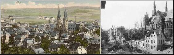 | There are many towns we never hear about, such as the town of Olpe in the southern Sauerland in North Rhine-Westphalia. The first archaeological finds in the Olpe area date to about AD 900. Olpe was first mentioned in 1220 and in 1311 was granted town rights by the Archbishop of Cologne, Count Heinrich II of Virneburg. History records evidence of witch trials being held in the Olpe judicial area between 1587 and 1697 and Olpe had its first school teacher in 1615. Another medium sized county town in the Olpe district is Attendorn. The town lies at the crossroads of two former long-distance roads, the Heidenstraße and the so-called Königsstraße. Here, in Charlemagne’s time, arose a parish. Under the St.-Johannes-Kirche lie the foundations of an old missionary church. In 1072, Archbishop Anno of Cologne endowed the Monastery here several royal rights. Both were typical very old timber framed German towns holding nothing of military importance. On March 28, 1945, a Wednesday in the Holy Week during the dying days of the War, at a time when Germany was basically defenseless, Olpe and Attendorn were heavily bombed in a major American attack to assist the Soviet offensive. 46 American Mitchell and Boston bombers dropped 309, or 32,000 pounds of, high-explosive bombs on Olpe's residential and commercial district and on Attendom from a height from 4300 to 3600 meters. The whistling of falling carpet bombs drowned out the shrill warning sirens in Olpe. Crowds of frightened people frantically sought shelter from the waves of bombers, but 119 civilians died, with 80 foreign workers/prisoners adding more to the death rate. In addition, 75 people were seriously injured. 215 dwellings were destroyed in Olpe and 42 in Attendorn, with hundreds more in severe disrepair. The majority of the death in Attendom took place in the Bahnhofstrasse, where women and girls were standing in line to shop with their Easter special food allocations. They were literally mowed down by the bombs in the surprise attack. Official findings said 150 people were killed immediately or soon succumbed to their injuries. Seven were missing. Survivor's account When War was over, Attendorn had another terrible terrible misfortune. At the time there was a part of the town hall in which the food office was located where many people went to pick up their food ration cards. In the basement was a large ammunition dump where, on the orders of the occupying Americans, bombs, grenades and other military equipment was collected and stored. OnJune 15 at 10: 30 a clock, an Allied soldier with a lighted cigarette went down into the basement and shortly after, a large part of the town hall blew up. The huge explosion claimed 35 more lives. |