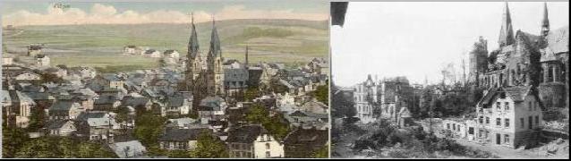 | Pirmasens, the site of Germany's oldest shoe factory, was first mentioned in 860AD as a cloister. It was chartered by Landgrave Ludwig IX. who built his residence and a military garrison there in 1763. When he died, the garrison was disbanded and the townspeople had no way to make a living, so the ex-soldiers fashioned the old leather uniform parts into simple shoes which their wives peddled. In the early and mid 19th century, the town experienced prosperity and built Europe's first shoe factories. American eye-witness account: "The Group Headquarters entered Pirmasens late the night of the 23rd and here at close range saw the devastating effects of allied aerial bombing. The town of perhaps fifty thousand was practically leveled. German families were huddled together wherever they could find shelter. Others wandered in a daze through still smoking rubble Broken water mains spouted water and the smell of death was everywhere. That night the Group found a place to bivouac near a mausoleum and cemetery at the edge of town. In back of the buildings were row upon row of coffins of the unburied dead and within the mausoleum was a large room completely filled with corpses. We were glad to soon move on. The following day the results of allied air power could be seen again along a mountain road. For well over a mile were at least two hundred dead horses from a German supply column that had been strafed, still harnessed to their wrecked wagons. I for one was not ashamed to feel the same deep sorrow and anguish that I had felt on seeing our dead GIs, and for that matter the young teen age dead German soldiers." |