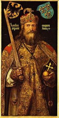 | Karl der Große was born of German blood and German language in Franconia (Frankin). He could speak ancient Teuton, Latin and Greek and he became king at age twenty-nine. Karl, the second son of Pepin the Short and Bertrada, was born in 751. In 754, Pepin convinced Pope Stephen II to crown him in exchange for defending Italy against the Germanic Lombards, a tribe occupying central and northern Italy. Karl saw war as a child riding with his father's army, and he would continue to personally lead men into battle throughout 53 campaigns. The Moslem governor of Barcelona asked for his help in defeating the Moslim caliph of Cordova, another Moslem, and in the year 777, Karl led the army across the Pyrenees until he realized he had been deceived. As he led his army back through the mountains, the Basques attacked his rear guard and killed nearly every man in the squad led by Karl's nephew Roland, a battle which became immortalized in song and story. In 795, Karl returned and conquered part of northeast Spain before again assaulting the persistent Lombards in Italy, a feat for which Pope Leo III crowned him Emperor of the Romans on Christmas Day in 800 AD. Charlemagne led and sent his armies far. He subdued the unruly Saxon heathens, giving them a choice between baptism or death, resulting in the beheading of 4,500 of them in one day for high treason. He drove back the advancing Slavs, defeated the Avars, and by the thirty-fourth year of his reign, he could resign himself to peace until his death in 814. He bestowed a governmental structure and unifying faith upon Western Europe which had been torn by religious and political strife for years. He managed to bring all of the people between the Vistula and the Atlantic, the Baltic and the Pyrenees, nearly all of Italy and much of the Balkans under his rule. Charlemagne made military service a condition of owning land and created a system of knighthood and noblemen, along with a whole code of moral behavior in order to build a strong military. Building upon the Roman system of feudalism, Charlemagne enabled this new noble military class to ensure the well-being of serfs who would in turn provide and supply the needs of the nobleman and his militarily. In this well planned society, Charlemagne can be considered the Father of Feudalism. He formed a structured society based on public participation in the government with assemblies of armed property owners, and he respectfully delegated various individual responsibilities to all. It was Charlemagne who first attempted to organize his kingdom by dividing his power with various levels of government: an aristocrat appointed as Count controlled the lords and nobles who in turn controlled the serfs or peasants on the fief of each knight. The counts took care of administrative tasks and supervised Church business and an appointed Bishop headed a diocese within certain borders. In those areas where there were potentially volatile situations, Charlemagne appointed a Margrave. By his formulation of the Chapters of Legislation, once a year they all traveled to the king's court at Aachen to convene and to discuss governmental business. Here they presented items for oral vote (out of the jurata, a custom in ninth century Frankish lands where a sworn group of inquirers was used to decide many local issues from land ownership to criminal guilt, came the jury system of modern times). In between these meetings, Charlemagne traveled to the various capitals of the region, and held assemblies of the nobles where they would hash things out and come to agreement on various issues. They also shared a good time with much joking and talking. To fill in the gap between meetings, he created a group of emissaries called the missi dominici who travelled throughout the kingdom hearing complaints, making sure that things were running smoothly and collecting taxes. Through the Capitulare missorum, the people of Francia had their own guarantee of equality, justice and freedom from tyranny four centuries before England’s Magna Carta was established. Under Charlemgane's enlightened rule, conscientious effort was made to transform barbarism into civilization through legislation pertaining to most aspects of civilized living from religion to government. A great bridge was built across the Rhine at Mainz to produce active trade and a stable currency was maintained. He even established a system of relief for the poor with taxation on the nobles and the clergy to pay its costs. Ancient Saxon poem: "Great and Holy Wotan, help us and our field general Wittekind and the captains to defeat Karl the Butcher. I give you an aurochs, two sheep and a beehive. I slaughter all your prisoners in your holy mountain realm." He called in foreign scholars to restore the schools of France and then organized the royal palace at Aachen as a teaching facility by sending for teachers from England and elsewhere, turning the palace school into an active center of study and the birthplace of educational reform that spread throughout the realm. Even Charlemagne himself was an eager pupil, as well as his family. While he studied Latin, he continued to speak German, and he compiled a German grammar and collected specimens of early German poetry. Out of his schools came the university system of Europe. Charlemagne was profusely generous to the Church, but also made himself its master, yet he also had open negotiations with Moslem rulers suggesting fair treatment of their respective minority populations. What we know as the Holy Roman Empire was born of a noble vision of world peace, order and civilization. German rulers of the nineteenth-century were enamored of the memory of Charlemagne. In 1843, Prussian king Friedrich Wilhelm IV had Charlemagne's tomb opened. His bones were still intact, except for part of the right arm, and his living height was calculated just over 6 feet. In 1861, 1874, and finally 1906 it was opened again. Einhard's "The Life of Charlemagne
