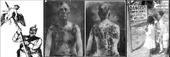 | German Americans were soon under siege as government-sanctioned vigilante groups sprang up nationwide to handle the "German problem". Forced to buy Liberty Bonds, imprisoned for making disloyal remarks and threatened by flag-kissing ceremonies, even children were victimized. Citizens from coast to coast were beaten, whipped, flogged, forced from jobs and even lynched. The situation grew so intense that even acts of murder were merely winked at, such as in the case of miner Robert Prager, above, who was hanged by an angry mob in Illinois because they "suspected" he might be a German spy. The perpetrators of this heinous act received no punishment. By 1918, most major newspapers had begun to subtly endorse curing "treason and disloyalty" by means of a noose or firing squad. From the President on down, the idea was put forth that "traitors" deserved harsh punishment. Incidents such as the Prager case did not elicit much adverse reaction or shock. They were instead justified as noble acts of retribution for the despicable crimes of "Huns". On Sept. 14, 1918, 200 people surrounded the Clark County, Wisconsin home of Mrs. Caroline Krueger because, as pacifists, her three sons refused to serve in a foreign war. When they stated “that it was not right to send American soldiers to France and that they never would go”, the mob riddled the Krueger home with bullet holes, killing one of the Krueger boys and a member of their mob in the process. Previously, on May 2, 1918, in San Jose, California, a German-American tailor was hanged by the local "Knights of Liberty" and no trace of him was ever found. In 1917 in El Paso, Texas, German-American Charles H. Feige was shot to death by a soldier as he took photos near the border because he "looked to be a German spy." No charges were brought. It wasn't only Germans that paid dearly. A headline in the September, 1918 Duluth, Minn. Herald read: "Knights Of Liberty Tar And Feather Slacker." Finnish immigrant Olli Kinkkonen was dragged from a boarding house and never seen again. The local Knights took credit for the abduction, saying it should to serve as "a warning to all slackers". Kinkkonen's body was found 2 weeks later dangling from a tree outside of town covered with tar and feathers. Duluth authorities declared the death a suicide. Olli, a logger and dock worker, didn't want to fight in the war and planned a return to Finland. No one faced charges for his abduction and death, and he was buried in an unmarked grave. Vigilantes in these years seldom got punished. Kidnapped Wisconsin German professor E. Schimler had come to America from Germany with his parents at age 14. He was kidnapped, robbed, tarred, feathered and left on a back road and forced to walk home naked. The police and the local media faulted him for 'not reporting the crime sooner', but the mob that committed the criminal act was not pursued. There were numerous other incidents of tarring and feathering. On April 11, 1918, Adolph Anton was kidnapped from his home by six armed men who bashed in his front door and grabbed him in front of his wife who was holding a baby. They dragged him off, tarred and feathered him and left him in the countryside alone and naked. The six "patriots" who did it were not charged. The Nonpartisan League was an agrarian movement around 1915 in North Dakota and Minnesota. League members advocated economic reforms to help farmers. Decried as "socialist" from its start, the League simply opted to endorse whichever candidates pledged to support their goals. Charles Lindbergh's father was an NPL member in Minnesota. Once World War I began, Leaguers were ruthlessly attacked as disloyal for not supporting war bond drives. In one case in 1917, farmer John Meintz, photo above, who had been subjected to at least three previous attacks by mobs, was dragged from home, tarred and feathered and threatened with lynching unless he left the state. Meintz visited the US Justice Department headquarters to obtain relief and justice, but found none. Children in a in Chicago park read a sign warning that only "loyal Americans" are welcome, and "pro-Germans" are in danger. In fact, 376 other farmers from Rock County, Minnisota were forced to register for war duty under threats of being deported from the state, and then the Minnesota state government via their zealous "Commission of Public Safety" crushed the League in 1918. In San Jose, California, when George Koetzer was taken from his bed, tarred and feathered, then chained to a gun in front of the McKinley Monument, the police found him.. . and arrested him. The Knights of Liberty in Tulsa, Oklahoma tarred and feathered a German-American before giving him 50 lashes and making him promise to leave the city. In April, 1918 in Seward, Nebraska, a gang of 20 to 30 men visited two German homes, tarring and feathering the farmers. In Illinois, yellow stripes were painted on the doors of German Methodists if they didn't buy Liberty Bonds, and four men, including a Catholic priest, were tarred and feathered in Christopher, Illinois. On April 22, 1918, in McPherson County, Kansas, forty masked men drove to the farm of pacifist Mennonite preacherWalter Cooprider, cut his phone wires and demanded he buy Liberty Bonds or be tarred and feathered. When his son asked to be substituted for his father, they tarred and feathered him on the head and shoulders. The mob then moved to another German pastor's house and tarred and feathered him as well. On June 3, 1918, the same mob raided the home of a poor local Pastor and demanded he write a $50 check for the Red Cross. The next day, he stopped payment on the check, so on June 10 they struck again, ransacked his home, stole his watch, money and smeared his house with yellow paint. Not satisfied, they dragged him into the barn where they whipped, tarred and feathered him. Both he and son his purchased Liberty Bonds the next day. Mennonites were constantly under siege. A judge in Cass County, Misso