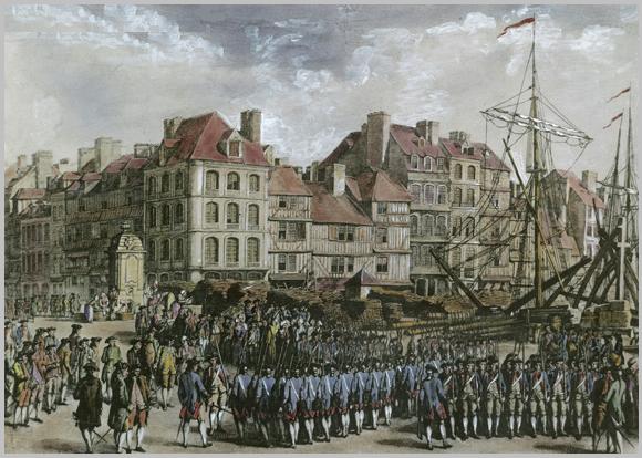 There were nearly 300 sovereignties and over 1,400 estates of Imperial Knights in Germany in the late 1600's to the early 1700's. Every one had its own financial, commercial and manufacturing systems and its own regulations and laws, and they were all governed by their own duke or prince who, with the privileged classes, his court and his army, ruled supreme. A map of the era would show the Kingdom of Prussia on one end, Austrian lands on the other, and hundreds of duchies, free cities, landgraves, principalities, electorates and bishoprics between and around. In the 16th century, Henry VIII of England officially hired German Landesknechts for his campaigns in France and Scotland. From the Middle Ages to the English Civil War, mercenaries were hired and incorporated into the English Army. The English hired Hessian soldiers during the War of the League of Augsburg, the War of the Spanish Succession, the War of the Austrian Succession and the Seven Years' War. Again, in 1745 during the Scots Rebellion, 7,000 Hessians were hired to help garrison England and Scotland. With American rebellion, England once again turned to the German princes, dukes and margraves who were hungry for a few extra bucks and anxious to sell or rent their soldiers The Hessian regiments sent to America remained in their own units with their own unit commanders, and often in their own brigades. King George III of England hired units from the German states of Braunschweig, Hesse Hanau, Waldeck, Anhalt- Zerbst and Hesse-Cassel, all commonly all called "Hessians", to assist with bringing the colonist's rebellion to order and he needed even more. At the time of the American revolution, the territories of Ansbach and Bayreuth contained about four hundred thousand people, and the financially troubled Margrave of Ansbach-Bayreuth, Christian Friedrich Karl Alexander, jumped at the English king's offer and committed 1160 of his troops, receiving £100,000 sterling for renting out his army. It was difficult, if not impossible, for the troops to avoid this service. Below: Ansbach-Bayreuth troops leaving for Amerika |