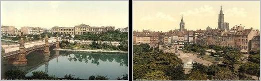 A Free Imperial city and seat of a bishopric, Strassburg was one of the larger cities of the Holy Roman Empire and the hub of the central Elsass (Alsace), a region of historical political fragmentation. The original site of Strassburg was a Celtic settlement captured by Romans and replaced by the fort of Argentoratum. Around the year 400, the Alamanni seized it from the Romans, and the whole of Alsace fell into their hands until it passed to the Germanic Franks at the end of the 5th century. The area of Lothringen (Lorraine) fell within the Roman provinces of Germania Superior and Maxima Sequanorum for 500 years, and witnessed the arrival of the Germanic Triboci. In the 5th century, other German tribes, including the Alamanni, arrived and stayed until driven out by the Franks, who then took the area. The name Lothringen is derived from Charlemagne's grandson, Lothair I., who was given the territory of Lotharingia in 843.The duchy was then re-established after the death of the German king Heinrich I. and it became hereditary in the Hohenstaufen family. In 842, the so called "Strassburg Oaths" between Charles the Bold and Ludwig the German were taken here. In 923, the Duke of Lothringen ceded the city to German King Heinrich I., firmly establishing the connection of the city of Strassburg with the German kingdom for the next seven centuries. In 1262, Swabian King Philip conferred imperial city status upon Strassburg, and the city on the Rhine was of major importance to trade, and Strassburg's early printing presses printed Luther's 95 Theses and the German bible between 1523 and 1534. A Catholic minority still lived in the city and monasteries continued to exist in the Reformation when Strassburg officially adopted Lutheranism in 1536. The Strassburg school system was distinguished and greatly advanced. The University of Strassburg, founded in 1567 and later be suppressed during the French Revolution, was a stronghold of German sentiment. Elsass was also home to a group of Anabaptists and later the scene of a peasants revolt. After the Schmalkaldic War, 1546-1547, Strassburg had to readmit Catholic religious masses and some prominent Protestant leaders fled the city. In 1551, the city accepted the Augsburg Interim. In the Thirty Years War, Strassburg took a stance of neutrality and escaped without major destruction. Elsass, however, was devastated by the Swedes and the French in the Thirty Years' War, and in 1648 tits German rulers had no choice but to cede the area to France in the treaty of Westphalia. Depopulated and uncultivated, it languished. Elsass-Lothringin was clearly German speaking when it came under French rule. French King Louis XIV., while planning to seize Holland, also wanted to take even more of the Rhine territory, and in 1680 laid his claim to a number of territories belonging to German princes who were so impoverished and depleted because of the wars that they were helpless in resisting his aggression. Strassburg, German and Protestant in character, was suddenly and unjustifiably seized and annexed by France during a time of peace and yet this dubious action received formal recognition at the Peace of Ryswick in 1697. Immediately this change favored Catholicism, but the city still remained essentially German until the French Revolution, when it was deprived of its privileges as a free town. The episcopal lands and smaller territories, including Mülhausen, which had been a republic allied to Germany, were annexed by France in 1789. Although Strassburg was annexed by France in 1683, it remained firmly connected to the German- speaking intellectual world throughout the 18th century, and the university attracted students from throughout the Holy Roman Empire, including Goethe and other great figures. In the war of 1870-71, Strassburg was bitterly surrendered back to her German homeland after a seven week siege in 1871. Before the Prussian-Franco War, more than half of the inhabitants still spoke German, and this proportion increased greatly afterwards. Elsass once more became German under Bismarck, who gave the people until September 30, 1872 to declare their loyalty to either Prussia or France. The overwhelming majority agreed to stay, but 45,000 elected to remain French, and left by choice. France would bitterly desire to recover the provinces they had themselves once stolen, especially since Strassburg had been greatly enhanced from costly German investments in its infrastructure. |