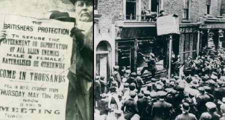 | Immediately upon the outbreak of War, the British government set up a War Propaganda Bureau (WPB) at Wellington House and Lloyd George appointed fellow Liberal MP Charles Masterman to head the shadowy organization created to fan the long simering war fever even more in Britain. In September, 1914, Masterman invited twenty-five leading British authors to discuss ways of best promoting Britain's interests during the war. Those who attended included Arthur Conan Doyle, Arnold Bennett, John Masefield, Ford Madox Ford, William Archer, G. K. Chesterton, Sir Henry Newbolt, John Galsworthy, Thomas Hardy, Gilbert Parker, G. M. Trevelyan, H. G. Wells and of course, Rudyard Kipling, inveterate Hun-hater and infamous apologist of the (British) colonial enterprise. All of the writers present at the conference were sworn to secrecy, and it was not until 1935 that their full activities became known to the public. Most had already been working for war. There were estimated to be 60,000 Austro-Hungarians, Germans and Turks in the country as well as 8,000 other citizens of "enemy birth". Inflamed by the intense propaganda, Germanophobia swept across Britain like a firestorm and mobs attacked German shops, homes and churches. 57 German civilians were killed during anti-German riots in Peterborough, London, Keighley, Newcastle, Liverpool, Manchester and elsewhere and the riots continued until the nation-wide riots in May, 1915. Rioting in London actually resulted in a local shortage of bread after so many German bakeries were vandalized, with bags of flour dumped and loaves of bread smashed. In some cities, naturalized Germans were pressured into signing statements stating their desire to see "Britain win and Germany crushed". Some newspapers called for the government to deport all German or Austrian citizens and many faced internment. The hate even extended to names which simply sounded German. One mob smashed all of the windows of a pub because they thought the Scottish landlord's name "Strachan" might be German. It was likewise in Britain's crown dominions. Germans were stripped of their civil rights, fired from their jobs, jailed as spies or deported. Their churches and schools were closed down and they were cheated out of their real estate and businesses. Wellington House relied mainly on pamphlets in the first part of the war. Although it used the press more extensively later, pamphlets were still prioritized because it was hard to disguise the official nature of a press article. There was even a small charge for the pamphlets because, as one modern writer observes, "people do not like to think they would buy propaganda." They published over 1160 inflammatory pamphlets and books between 1914 and 1918 including: 'To Arms!' ( Doyle), 'The Barbarism in Berlin' (Chesterton), 'The New Army' (Kipling), 'The Two Maps of Europe' (Belloc), 'Liberty, A Statement of the British Case' and 'War Scenes on the Western Front' (Bennett), 'Is England Apathetic?' (Parker), 'Gallipoli and the Old Front Line' (Masefield), 'The Battle of Jutland' and 'The Battle of the Somme' (Buchan), 'A Sheaf and Another Sheaf' (Galsworthy), 'England's Effort and Towards the Goal' (Ward) and 'When Blood is Their Argument' (Ford). One of the first pamphlets to be published was the 'Report on Alleged German Outrages' at the beginning of 1915 about the German Army allegedly systematically torturing Belgian civilians. Conan Arthur Doyle, when he wasn't trying to convince people of the reality of fairies, borrowed much of the same material he'd used with success when writing sensational accounts of the atrocities in the Belgium Congo a few short years before, such as the nasty Belgians cutting hands off of the Congolese. Doyle simply revamped the stories into Germans cutting off the hands of Belgian babies. By 1917, Wellington House, had 54 staffers. Its governing body met daily and included advisors such as Arnold Toynbee and Lewis Namier. Namier (1888-1960) was born in Poland and wrote such notable books as "Structure of Politics at the Accession of George III" and "England in the Age of the American Revolution". Toynbee (1889-1975) was a prolific author and pamphleteer during the War regarding "alleged German atrocities". Toynbee drew heavily on The Bryce Report for his own "The German Terror in Belgium: An Historical Record". He wrote a similar book on the massacre of the Armenians. He would work for the Foreign Office during both World Wars. Among Americans who took up the English cause was Dr. Charles W. Eliot (1834-1926), former President of Harvard. Masterman picked Canadian Sir Gilbert Parker to direct British propaganda toward the States. He manipulated American war correspondents operating out of London by, among other means, arranging staged tours of the front. He farmed through "Who’s Who in America" to build a 200,000 name mailing list of influential Americans to whom he provided articles, pamphlets and speeches on war topics written solely from a British perspective. He and his staff also provided substantial war related materials to 555 American newspapers and hundreds of libraries with full approval of the allegedly neutral US Government. Over the next two years, 90 artists also worked for Masterman creating propaganda illustrations. He arranged for whole teams of artists to visit France, but only British officers were allowed to take actual photos of the Western Front, the penalty being the firing squad for anyone else, and photos of dead British soldiers were banned. On September 11, 1914, the British four part Press Bureau and the Home Office had formed the Neutral Press Committee to disseminate news to friendly and neutral nations under G. H. Mair, former newspaper assistant editor. He collected summaries of foreign news to track changes in public opinion overseas to help his propagandists. He divided the "Neutral Press Committee" into four parts to "exchange news services between British and foreign newspapers; the p
