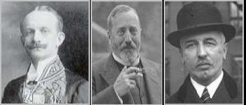 | Back in the US, there was overwhelming public sentiment for neutrality in 1914. When the weekly magazine Literary Digest sent a questionnaire to 367 American newspaper editors asking which side had their sympathies in the European conflict, 105 editors responded that they favored the Allies, 20 favored the Central Powers, and 242 designated no preference. For over one hundred years, the U.S. foreign policy maintained a tradition of having no direct military involvement in European wars. Unlike British propaganda, German propaganda was a dismal failure. Aside from the fact they did not share a common language with America, Germans underestimated the depths of hatefulness to which the British had sunk and would continue to sink to sway US public opinion, nor did Germany recognize the financial forces behind the intense British media campaign. The Kaiser was also naive to expertly adept enemy agents within his own government. Germany's concern was simply that America remained neutral, but Britain had taken away any feasible means by which Germany could spread their messages or even provide their viewpoints. Moreover, the puny German "propaganda headquarters" had plunked itself transparently smack in the middle of New York City and was run by the German ambassador to the USA himself who was either an idiot or a knave. The pro-war forces jumped on them and they made themselves extremely easy, almost too easy, prey. Count Johann Von Bernstorff, below left, was the new German Ambassador to Washington in August, 1914, after war had broken out in Europe. Included on his staff was Dr. Heinrich Albert, center, and Dr. Bernhard Dernberg, right. Also Capt. Franz von Papen, military attache, Capt. Karl Boy-Ed, naval attache, and Wolf von Igel.* |