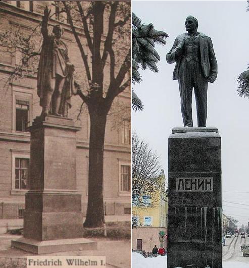 By February of 1945, thousands upon thousands of panic stricken refugees who managed to survive the grueling exodus from the eastern regions flooded into Dresden and other towns and cities seeking shelter and help. On the 14th and 15th of February, Dresden was incinerated. Virtually every city that refugees were known to have flocked to, from Kiel to Swinemünde, suffered from major catastrophic Allied bombing attacks as part of "Operation Thunderclap" and "Operation Clarion" at the hight of their exodus. Two Allied air raids were carried out on the old city of Königsberg on August 26/27 and August 29/30, 1944 based on "misinformation" from Churchill that it was a "a modernised heavily defended fortress." 90% of the city of Kant was absolutely destroyed and it burned for several days. The entire historic city center, including the cathedral, the castle, the old churches, the old and the new universities and the old shipping quarter were entirely destroyed. After the Red Army's capture of Königsberg under General Chernyakhovsky, the wreckage of the city was cordoned off and turned into a giant internment camp, then a mass grave. The Red Army immediately and methodically set about erasing any trace of former German presence, starting with the human beings who did not or could not get out in time. Out of Königsberg's prewar population of 316,000, an estimated 50,000 to 75,000 people were still present in the ruins of the devastated city on the day of capitulation and thousands did not survive the communist orgy of bloodshed and revenge. Many that did survived murder soon met their end by starvation, disease and freezing to death. Probably no other German city paid so cruel a price for defeat. 90,000 German military prisoners were also taken, almost none of whom were never heard from again. During January and February of 1945, the "evacuation" of surviving German began, including those who had returned to reunite with or save their families. Almost two years later, in October of 1947, there were still 30,000 Germans in the city and they were shipped by trains to the future GDR or sent to Soviet gulags. In February of 1948, the Ministerial Council of the USSR decided to "resettle" all remaining Germans they discovered in East Prussia to the GDR, officially declaring them illegal residents. According to Soviet sources, 102,125 persons were "resettled" to the GDR in 1947 and 1948, but only 99,481 arrived (GDR authorities attributed this to "perhaps a Soviet calculation error.") In May 1951, another 3,000 East Prussian were shipped to the GDR. These last remaining German residents were expelled in more ethnic cleansing of 1949-50. Thousands totally vanished and are presumed murdered. Below: Victims of Allied bombing; Kalinin, Ehrenburg; Street sign in today's Rostock, Germany; Victims of the Red Army; Right: The monument in Gumbinnen, East Prussia honoring Prussian King Friedrich Wilhelm 1, who offered a homeland to thousands of refugees from all over Europe was replaced by a monument to a Red Army general (click) |