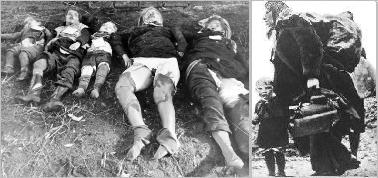 In August, 1944, news got out that in the East Prussian villages of Nemmersdorf and Goldap, the Red Army had raped, tortured and murdered all of the inhabitants down to the last baby. In Nemmersdorf, reporters from Switzerland and Sweden were present when the grisly atrocities were uncovered. In barns, houses and sheds where the Red Army had discovered civilians hiding, they had not only machine gunned them but had thrown hand grenades into the groups. 95 German civilians were murdered in this bestial fashion in the Nemmersdorf area of Schulzenwalde, above. Below: Swiss journalists photographed bodies of two raped and murdered German women and three children also murdered by the Red Army in Metgethen, East Prussia, another plaec of slaughter. This scene soon played out in West Prussia, Pomerania, Silesia, the Sudetenland and other areas of eastern Europe. The Red Army was cajoled to behave in Germany "as Mongolian hordes of old" by Stalin's propagandists, among whom was the grand master of hate, Ilya Ehrenburg, who encouraged troops to injure, torture, rape and kill all German civilians. As the violence spread, the only option for the endangered East Prussians was to flee, and they would face uncounted scenes of terror. In an article of March, 3,1945 Ehrenburg emphasized that the "historical mission of the Soviet army consists in a modest and honorable task of reduction of the population of Germany." Ehrenburg whipped the Red Army into such a pathological fury of hatred that by the time they arrived in East Prussia it was easy to rape and kill the mostly female population. There were reports of young women in East Prussia having been crucified on barn doors, tied up by their legs and torn in two by cars, or groups of naked girls being tied to a rope like fish on a line and dragged behind wagons, or of small groups of children being found with their tongues nailed to tables and lifeless babies discovered with their skulls broken and bodies punctured by bayonets. It is said that every captured woman between eight and eighty was violently raped, most multiple times and many were killed after. "The Germans are not human beings. From now on the word German is for us the worst imaginable curse and strikes us to the quick. We shall not get excited. We shall kill. If you have not killed at least one German a day,you have wasted that day....for us there is nothing more joyful than a heap of German corpses." IIya Ehrenburg. In the winter of 1945, East Prussia was cut off from the west, the only escape route for many being from the small port of Pillau and over the Baltic Sea toward the west. Throngs of desperate Königsberg civilians had only one way out, a frigid walk over half frozen lagoons to Frische Nehrung, a narrow slice of land, from where they hoped to reach Danzig. Almost a million people are said to have tried this perilous crossing. Survivors later recounted the hopelessness and horror of making this deadly trek in the dark as whole families pulling carts and sleds filled with children and the elderly slid into holes in the ice and plunged into the unforgiving sea. In daylight, Soviet planes circled overhead and intentionally cut off large ice floes with artillery fire, sending them hopelessly adrift. Those who escaped on land joined an endless parade of stunned, bereaved people on overflowing roadways. They witnessed whole cartloads of people crushed and mowed over by advancing Russian tanks, with wailing children and frantic mothers stretched for mile after mile of human misery. Unprepared for the 60 degree below zero wind chill and deep snow, some turned back home in despair. Blazing farms lit up the horizon, burned by the Red Army or set on fire by hopeless owners who then committed suicide. This was the "orderly and humane expulsion" of Germans that Churchill, Roosevelt and Stalin shook hands to. More than 1.9 million of nearly 2.4 million East Prussians joined by Germans from central Poland fled westward under horrible conditions. 173,000 people could not or would not leave. Later, researchers of the Federal Archives counted 3,300 locations just in areas they had access to where at least 120,000 German civilians were either shot or beaten to death by the Red Army. "The German 'good fellows', those who at home give way to sentimentalities, piggy-backs to their kiddies and feed the German cats with morsels of their rationed hamburgers, murder Russian children with the same pedantry as do the bad Germans. They murder because they have come to believe that only people with German blood are worthy of living on this earth of ours." Ehrenburg The Germans initiated "Operation Hannibal" to withdraw German civilians and troops from East Prussia. Beginning on January 21, 1945, it ended up being one of the largest emergency evacuations by sea in history and one of the German Navy's most significant achievements. In a period of about 15 weeks, between 500 and 1,080 merchant vessels of all types and numerous naval craft, including Germany's largest remaining naval units, transported about 900,000 refugees and 350,000 soldiers across the Baltic Sea to Germany and occupied Denmark. But not all rescues were successful. The Wilhelm Gustloff was a 25,000-ton passenger liner. On January 30, 1945, when it steamed out of Gotenhafen, it carried a crew of 1,100 officers and men, 73 critically wounded soldiers, 373 young women of the Women's Naval Auxiliary and more than 6,000 desperate refugees, most of them women and children who had reached the safety of the ship after grueling personal ordeals. The Gustloff was 13 miles off the coast of Pomerania when 3 torpedoes from a Soviet sub under the command of Captain A.I. Marinesko, struck the ship. 90 minutes later it sank under the icy waves of the Baltic. Barely 1,100 survived. At least 7,000 Germans died. A few days later, on February 10, Marinesko struck again and sank the German hospital ship the General von Steuben carrying 3,500 wounded soldiers and 