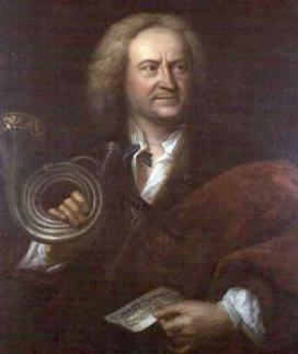 | Gottfried Reiche, 1667 - 1734, is best known for having been Johann Sebastian Bach's chief trumpeter at Leipzig from Bach's arrival there in 1723 until Reiche's death. Reiche was a skilled trumpet player and composer of the Baroque era, and Bach wrote amazing and difficult trumpet parts for him to play. He was so highly esteemed that in Leipzig he was paid more than other musicians so that he would not leave and seek employment elsewhere. In the famous painting of him by Leipzig artist E.G. Haussmann, done for the occasion of Reiche's 60th birthday in 1727, Reiche holds a coiled natural trumpet in his right hand and a sheet of manuscript, on which is written a short "abblasen", his famous fanfare, in his left. |
