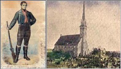 | They soon built a combination church and parsonage and a log cabin school named St. Lorenz after their church at home. In 1846, a second group of about 90 more emigrants journeyed to Frankenmuth. Pastor Löhe then organized the three other colonies in Michigan. Immigration continued through the end of the 19th century as friends and relatives of settlers joined them. Above: settler Lorenz Lösel and the permanent church. Frankenmuth stayed somewhat loyal to its founders’ intentions for over a half century, and remained a culturally isolated German Lutheran enclave. In 1847, there was a religious divide, and many of the Franconians joined with Saxon German immigrants from Perry County, Missouri to form what eventually became the Lutheran Church-Missouri Synod. When the first Frankenmuth settlers boarded the train from Albany to Buffalo, New York on their journey to Michigan, they sang an old German hymn of thanksgiving called 'Nun danket alle Gott' |