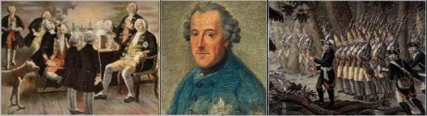 | Above: Friedrich and his brother visit at his father's tobacco party; The only portrait Friedrich personally sat for painted in 1763 by Johann Georg Ziesenis; The Seven Years War |