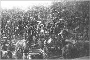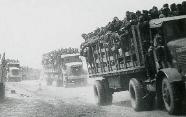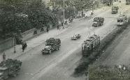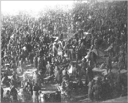 | In 1945, thousands of German POWs were jammed into US Army vehicles going through towns such as Nürnberg and Emskirchen (below). They often traveled for hundreds of miles without being able to sit and with no food, rest or relief stops. Hundreds of German prisoners were confined in makeshift US camps. Some were sent to fields, mudholes, quarries and other hell holes. The photos below show the magnitude of the situation. (Click to enlarge) |