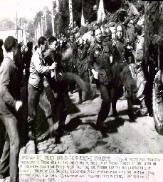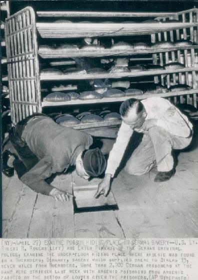 | Below left to right: 1945 German POWs at their new home in Verdun, France; POWs captured in France; About 250,000 Germans (including most of the Afrika Korps) and Italians who surrendered in Tunis in May 1943 taken as prisoners of war where they sweltered in large pens in the desert heat (many survivors were later sent to Egypt and camps in the US and elsewhere). Captured POWs being abused by mob. Lastly, "poison bread incident" wire photo. The New York Times reported: "NUREMBERG, Germany, April 22 (AP) U S Army authorities said tonight that additional German prisoners of war have been stricken with arsenic poisoning, bringing to 2,283 the number taken ill in a mysterious plot against 15,000 former Nazi Elite Guard men confined in a camp near Nuremberg."And on April 23, 1946, it stated: "POISON PLOT TOLL OF NAZIS AT 2,283; Arsenic Bottles Found by U.S. Agents in Nuremberg Bakery That Served Prison Camp". |