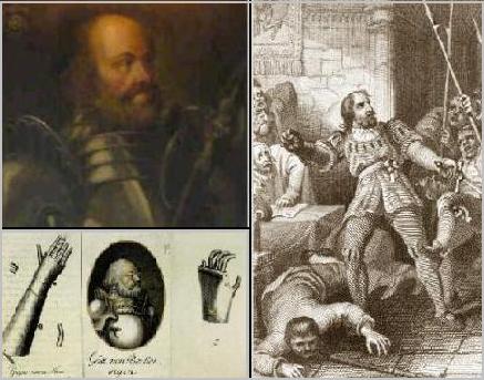 | Gottfried von Berlichingen, German knight, was born to a noble family around 1480 at Jagsthausen castle in Württenberg. In 1497, at the age of seventeen, he entered into the service of Margrave Friedrich IV of Brandenburg-Ansbach and was sent to Burgundy, Lorraine, Brabant and then Switzerland for Emperor Maximilian I. He then became a mercenary soldier and raised his own company of freelances around 1500, and took part in various small wars. At the siege of Landshut in 1505, while in the servicee of Duke Albert IV.of Bavaria, he lost his right hand. Now fighting despair, he remembered a battle where he had witnessed a one-armed servant fighting. Inspired, and while still in recovery, he hired a blacksmith / saddle maker to craft him a simple mitt to replace his missing hand. But it was not efficient enough to do anything, and he decided he needed a prosthetic device which would allow him to hold the reins of a horse and a lance, so he had a new hand fashioned of iron which was unlike any others previously made. In spite of the iron hand, his occupation continued, but now he fought in various feuds and mainly for booty and ransom. In 1512, he assaulted some merchants returning from the Leipzig fair and he was put under the ban of the empire by Maximilian until 1514 when he paid a 14,000 gulden fine. In a feud with the Principality of Mainz in 1516, he raided Hesse and captured the Count of Waldeck, Philip IV. upon whom he forced a 8400 gold gulden ransom, resulting in another ban in 1518. When the Duke of Württenberg, Ulrich I., was attacked by the Swabian League in 1519, von Berlichingen signed up for his service to defend Möckmühl, but a lack of ammunition and provisions forced to surrender the town whereupon he was taken prisoner and handed over to the citizens of Heilbronn, a town he had raided several times, until released in 1522 when he paid a 2000 gulden fine and swore an oath not to take vengeance on the League. During the Peasants' War of 1525, rebels in the Odenwald district chose Goetz as their leader, but he accepted only reluctantly and within a month took the first opportunity to escape to his castle. For his part in the revolt, he was called before the diet of Speier, but acquitted. The Swabian League had not forgotten him, however, and they lured him to Augsburg to ostensibly clear himself of the charges made against him on the League's behalf. Despite their promise of safe conduct, on November 28, 1528, they had him seized and imprisoned for two years. After repeating the oath he took in 1522, he was let go in 1530 on the condition he would not leave the immediate vicinity of his castle, Hornberg on the Neckar. For ten years he stayed there peacefully until Emperor Karl V released him from the oath in 1540. He was then sent to fight against the Turks in Hungary in 1542, and in 1544 he accompanied Karl V in an invasion of France, after which he finally returned home. He lived out the remainder of his life at Horneck castle until his death on July 23, 1562. Hornberg on the Neckar was built in 1420 and was given to the Teutonic Order by Konrad von Horneck in 1438 and became the seat of the "Deutschmeister" until it burned during the Peasants' War in 1525. Despite its reconstruction afterward, Mergentheim became the new headquarters for the Teutonic Order in that region in 1527. Goetz married twice and lived there with his family of three daughters and seven sons. Goetz's original iron arm is still in existence at his former castle. This sophisticated device allowed him to hold a feather pen, a sword and even playing cards. Over 400 years later, it inspired similar models to be designed by Berlin orthopedic surgeon Ernst Ferdinand Sauerbruch for use in World War One. This artificial hand was the first satisfactory arm and hand prosthesis in modern times. Goetz von Berlichingen left a lasting mark, and his life was the subject of numerous stories, including a famous play written by Goethe, "Goetz von Berlichingen", which was published in 1773. Goetz is also the father of an irreverent expression. In a reply to the Bishop of Bamberg's demand for his surrender, he said: "Er aber, sags ihm, er kann mich im Arsche lecken!" ("tell him that he can lick me inside my ass!") which is commonly quoted as "Leck mich am Arsch" ("Lick me on my ass") and often either preceded or followed by, "...in the words of Götz von Berlichingen" |