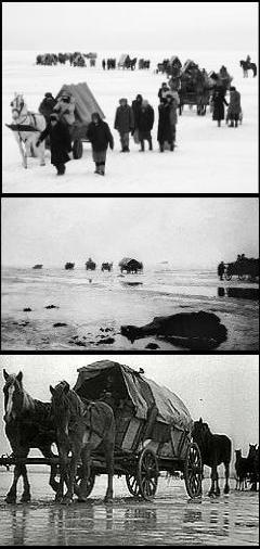 The Trakehner is one of Germany's oldest warmblood breeds. The Teutonic Knights discovered a small, primitive horse, the Schwaikenpferd, native to the Baltic area around East Prussia in the 13th Century and used it to breed military horses. Later, farmers used the horses for light work. Friedrich Wilhelm I of Prussia, needing a faster, sounder horse, established the breed for his soldiers in 1732. War tactics had changed and a lighter horse with more endurance and speed was required rather than the heavier horses previously needed to carry armor and haul heavy equipment. He chose the best horses from seven of his royal breeding farms, and established a stud farm in East Prussian at Trakehnen and had his soldiers clear the forest between Stallupönen and Gumbinnen. In 1739, the king gave the stud farms to his son, the future Friedrich the Great. The results were very successful and the best quality, the Trakehners, were reserved for his army, and the average horses which were sometimes bred with everyday East Prussians local horses were sold as riding horses. It became state property after his death and was named the Königlich Preußisches Hauptgestüt Trakehnen. Between 1817 and 1837, Arabian, Turkish, and Thoroughbred blood was added to the Schwaike mares. The Trakehner evolved into an outstanding, beautiful and respected horse the world over. By 1918, 60,000 mares were bred to East Prussian stallions each year. After the Treaty of Versailles limited Germany's army to 100,000, the horses were again reduced to farm work and heavier reinforcement sires were used to make the horses stronger. In the 1920s and 1930s the breed was improved and it won medals in various steeplechases as well as in two Olympics. By the 1930s, there were more than 10,000 breeders and 18,000 registered mares. Alas, fate would deal as fatal a blow to the magnificent Trakehner horse breed as it did to the East Prussian people in the desperate, terrible flight out of East Prussia at the end of World War Two. The orders came at the very end of the war, as the Red Army was closing in fast, to evacuate the horses from the Trakehnen stud farm. Click to enlarge picture below |
