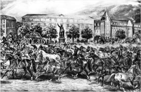 The rescue of about 800 of the best horses was attempted, and after being hand selected by their heart-broken owners and breeders, the horses were desperately sped out of East Prussia by train and on foot. Above: The horrible sight on October 17, 1944 as Trakehners in flight from East Prussia run past the Soldier King's Monument in Gumbinnen. Photgraph from a painting by Carl Engel. Sadly, most of the horses, together with their documentation, fell into the hands of the occupation forces and were shipped to Russia, to be lost forever. The private owners and breeders, also fleeing for their lives, hitched their heavy wagons to another 800 or so of these noble horses, and headed west in the infamous "Trek'' during brutal winter weather. Others were simply set free. Many of the horses were pregnant. For two and one half months on the horrible, frantic 600 mile flight, the horses' feed ran out and many mares lost their foals, became ill or went lame. Many perished along with the refugees when they slid into a watery grave in the frozen Baltic and others were gunned down along with their owners by the Soviets circling overhead. Witnesses encountered many of the noble horses dead along the route, shot to death and flattened by Russian tanks. At the end, many beautiful horses were eaten by starving refugees, forced into heavy labor hauling rubble or put to use as taxi drivers due to the severe fuel shortages, all uses they were never intended for. By the time they reached the West, only about 100 of the Trek horses had survived and they were in horrible condition. Others had spread out all over Germany, but only a few hundred of the original 80,000 Trakehners in East Prussia survived. However, these few tough, strong surviving horses became the founders of today's hardy Trakehner horse breed. The last original Trakehner was Keith, born there in 1944 and died in November, 1976. A very dedicated Dr. Fritz Schilke of the East Prussian Stud Book Society attempted the difficult task of locating all of the East Prussian horses that had made it to the West, and in 1947, the West German "Trakehner Verband" was established with a Trakehner Stud Book that continued to document the breed. Later, unlike other German breeds, the Trakehner had no mother state and could not depend on government funding. Therefore, re-establishment of the breed originally depended on the determination of its members and the generosity of others. At the time, many Trakehnen horses could be identified only by the Ostpreußische Elchschaufel, the East-Prussian moose horn branding of a single moose antler brand on their right hip or by the double moose antlers on their left hip. Today, all Trakehner breeding stock has to undergo rigorous grading methods to maintain the high standards. |