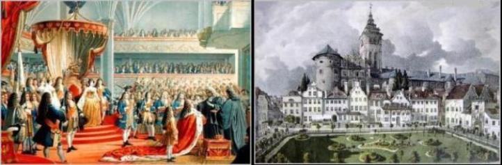 | By the time Germany became an Empire, her fortunes were the fortunes of Prussia. To understand how this came about, one must begin with a brief background of the Kingdom of Prussia. Brandenburg was one of seven Electorships of the Holy Roman Empire from the late medieval period, and controlled by the Bavarian royal Wittelsbach family from 1323 until 1415 when Emperor Sigismund granted it to the House of Hohenzollern. From the year 1442, Berlin became the residence of the Hohenzollerns. The Hohenzollerns embraced Lutheranism and acquired Ducal Prussia in 1525 and Albrecht of Brandenburg-Anspach secularized the Prussian holdings of the Teutonic Order. In 1618, Brandenburg then expanded its lands to include, among other territories, the Duchy of Prussia. East Prussia, along the southeastern coast of the Baltic Sea, enclosed the bulk of lands of the now- extinct old Prussians. In prehistory, the east of the area was inhabited by the Eastern Balts. In time, the Western Balts consolidated into the Old Prussian nation, while the Eastern Balts, including the "Curonians", consolidated into part of Latvia and Lithuania. Parts of the Baltic region remained wilderness for longer than anywhere else in Europe. About 350 BC Pytheas called the territory Mentenomon and the inhabitants Guttones, neighbors of the Teutones. The territory was called "Brus" ("Prus") in an 8th century German map. Vikings penetrated into the area in the 7th and 8th centuries and many were absorbed into the local population, especially in the bigger trade areas such as Truso and Kaup where they were said to travel nack and forth across the Baltic Sea. In expeditions launched by the Vikings and Danes later, many areas in Prussia including Truso and Kaup were destroyed.The old Prussian language belonged to the Western branch of the Baltic language group, but old Prussians spoke a variety of tongues, including German, and some related to modern Latvian and Lithuanian languages. Eastern Prussia from the 13th century on was almost entirely German as a result of German settlers. In 1457, Königsberg became the center of the Teutonic Order or Knights. All across East Prussia, the landscape was dotted by old castles of the Teutonic Knights. During the siege of Acre in 1190, the Teutonic Order began as a hospital brotherhood to care for the many sick German crusaders who were denied medical care from others. It was turned into a military-monastic order in 1198, reflecting the involvement of the Hohenstaufen dynasty in the Holy Land. The order conquered territory in the Holy Land, and then, under grandmaster Hermann von Salza, Eastern Europe, where they rose to prominence. They were in Hungary by 1211-25. After 50 years of war, the knights had subdued the pagan Prussians, who had risen in revolt repeatedly and were now reduced to serfdom. The order allied themselves with the Polish dukes of Masovia and Silesia to both subjugate the Prussians and fight against Novgorod. In the 13th century, more German emigrants arrived to settle the Prussian lands, and the Order was now an independently formed, noble political entity, and in 1243 and in 1263, the Pope allowed the knights to monopolize the grain trade. The Grand Master went to Venice after the fall of Acre in 1291, and then, after conquering Pomerelia in 1309, to Marienburg in Prussia, absorbing the Sword- Brethren in Livonia whose expansion had taken place further east. The knights administered their lands from Marienburg and granted considerable freedom to the cities, many of which joined the Hanseatic League. The Order was defeated in 1410 at Tannenberg by Poland and Lithuania, and after a revolt in its own territories it became a vassal of Poland. Since 1618, both Brandenburg and Prussia were ruled by the Hohenzollerns, and beginning with the "Great Elector" Friedrich Wilhelm I. after the devastation of the Thirty Years War, its brilliant leaders managed to take backwater Brandenburg to a pinnacle of power and prosperity in Europe. Since there was a sparsely populated Polish region sandwiched between two German regions. Brandenburg acquired another stretch of Baltic coast in eastern Pomerania in 1648 so as to bridge the territorial gap between Brandenburg and ducal Prussia. In the year 1657, Elector Friedrich Wilhelm finally succeeded, through minor wars and diplomacy, in severing the feudal link between his duchy and the Polish kingdom, and Poland conceded its loss of ducal Prussia in the treaty of Wehlau in 1657. With the peace of Oliva, 1660, Prussia was recognized as an independent duchy belonging to Brandenburg. Under the direction of Friedrich Wilhelm, Brandenburg’s small, but professional army also defeated their former allies/occupiers, the Swedes, in 1675 at Fehrbellin. These achievements enabled Friedrich Wilhelm's son, Friedrich III of Brandenburg, to achieve prominence in 1700 when the Austrian emperor Leopold I needed his help in the War of the Spanish Succession. Since there were no German kings within the Holy Roman empire apart from the Habsburg kingdom of Bohemia, Leopold allowed Friedrich to become the King of Prussia. Thus, Friedrich III was crowned King Friedrich I of Prussia in Königsberg, East Prussia in 1701, below |