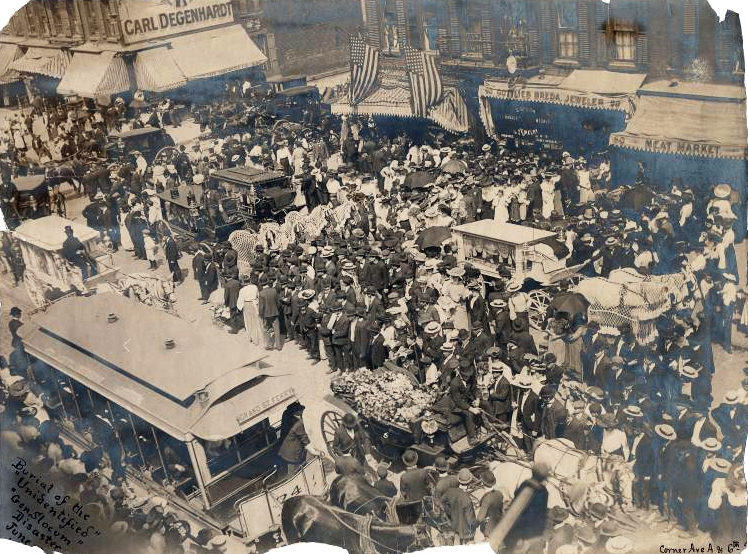 Between 1820 and 1880, many Germans initially settled in a section of New York city east of the Bowery and extending from Houston Street to 12th Street. In the 1850s alone, about 800,000 Germans entered the US by New York resulting in a steady growth of "Kleindeutschland", or Little Germany, a densely populated German neighborhood around Tompkins Square Park in the Lower East Side. Between 1855 and 1880, German New York was the third largest German speaking city of the world and Kleindeutschland held about half of the city's German population. 80,000 Germans lived in Kleindeutschland by the 1870s, and in 1871 Kleindeutschland alone would have been the fifth largest city in the German empire. Its diverse population represented the many German states and their inhabitants who, with their regional dress, customs and dialects, still thought of themselves as Bavarians, Prussians, or Saxons rather than as 'Germans', even after German unification in 1871. Bavarians dominated the city around 1880, and 43% of second-generation Bavarians were still marrying from the same ethnic group and another 22% were married to someone from an adjacent region. Endogamy was even more prevalent among Prussians who were soon the largest German nationality in New York. The neighborhood had its own clubs, lodges, theaters, athletic associations, bookshops, stores, restaurants and beer gardens. More than half of the bakers and carpenters in New York were of German origin, and many Germans also worked in construction. The German Lower East Side formed a trade junction between Europe and German-American traders who supplied goods to both rural and urban settlements in North America. There was a large German book market as well as a lively theater and music scene. Kleindeutschland had been a happy home to New York’s Germans. One of the deadliest peacetime maritime disasters in American history ( and the worst one in New York's history ) would devastate their community when, on June 15, 1904, over 1,000 of them died when their steamship caught fire in New York's East River. The General Slocum was a ship with a bad safety record and a history of bizarre accidents and untimely collisions. St. Mark’s Lutheran church in Kleindeutschland organized an outing every year and chartered an excursion boat for a day of swimming, fun and food at a nearby recreation area, Locust Grove on Long Island Sound. 1,300 plus people boarded the General Slocum on this fine day. The band played as the happy passengers left the dock at 9:30 am, the music to include a typical mixture of German and American songs: Unser Kaiser Friedrich, America, Poet and Peasant, Bird of Passage, Waldvoeglein, Vienna Swallows, Swanee River, On The Beautiful Rhine, Dutch Patrol, Hip Hip Hurrah, Carousal, College, Ever or Never, Under The Double Eagle, The Picadore, Werner's Parting Song, Children's Carnival, Princess Pocahontas, Mrs. Sippi, Home Sweet Home. 'Unser Kaiser Friedrich' ( the 'Kaiser Friedrich Marsch' ) was to be played again on the return voyage. It never had the chance. The ship meandered up the East River. Just beyond East 90th Street, smoke was spotted billowing from below deck. A barrel of straw below had caught fire and, partly because the ship's hoses were rotten, the crew failed to put out the fire, which within ten minutes became too big to handle. By the time they notified Captain William Van Schaick, it had become an inferno. Fearing an explosion if he dared dock near the many oil tankers along the East River piers, he decided to race at full speed to North Brother Island a mile ahead. Spectators on shore frantically shouted for him to dock the floating inferno, and the little boats following him watched in horror as the increased speed wildly fanned the flames which were also accelerated by the ship's fresh paint. As the fire spread over the whole ship, people had no choice but to leap overboard in a horrible scene of panicked, screaming people, some clinging to the side rails as long as they could before dropping into the murky water where whole families drowned. Only a few were rescued by nearby boats. Even though there were 3,000 lifejackets on board, they were all rotten and actually served to pull down those who wore them into the water. The lifeboats could not be dislodged in time and would not have been able to be used anyway while the ship was speeding. When the blazing ship finally reached North Brother Island, the remaining passengers leaped off the ship, while nurses and patients from the island’s hospital rushed to offer help. Area boats picked up the living and the dead from the water in the wake of the ship, and the death toll stood at 1,021. Thousands of family members and friends gathered at St. Mark’s Church anxiously waiting for word of survivors, while others raced to the pier designated as a temporary morgue. Some people lost their entire family in the tragedy, and funerals were held every hour for days on end in the churches of Kleindeutschland. Several people who lost their whole families committed suicide as a result. The city held an investigation and Captain Van Schaick, executives of the Knickerbocker Steamboat Co., and the Inspector who certified the General Slocum were indicted within weeks. Captain Van Schaick was convicted of criminal negligence and manslaughter and sentenced to ten years hard labor in Sing Sing prison, but was pardoned after three years. He lived the rest of his life in seclusion. The Knickerbocker Steamship Company, however, escaped with only a nominal fine despite the fact that the company had falsified records regarding passenger safety. Most survivors and their relatives departed from Kleindeutschland, unable to remain in a neighborhood so scarred by sadness and tragedy. By the 1910 census, only 10% of New York's Germans still lived in Kleindeutschland. The Slocum tragedy all too soon faded from memory, replaced by the Triangle Shirtwaist factory as the city’s most notorious fire