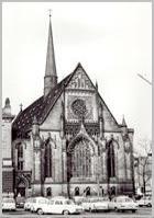 | On May 30, 1968 at 11AM, the church, which had survived the vicious Allied bombings of Leipzig, was destroyed. The communist leadership of Paul Fröhlich and Walter Ulbricht had made the decision on "ideological" grounds and left only seven days to prepare for the demolition and rescue of artifacts from the church. A weeping crowd of Leipzigers gathered to watch one of their most precious monuments be blown up off of the avenue which had been renamed "Karl Marx Platz". The rubble was cleared and piled at the edge of the city where it is now covered by a small hill with a small wooden cross which reads, "Paulinerkirche 1968." (move mouse over image, left) |