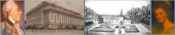 The royal palace was the Ansbach Residenz, above center left, but Karl Alexander preferred his hunting estate in Triesdorf. Here he renovated the "White Castle", above center right, for his lover Hippolyte Clairon, the Villa Sandrina for his lover "Fräulein Kurz" and the "Red Castle" for himself. He built the "Round Villa" (Villa Rotunda) for his new guest, Lady Craven. |