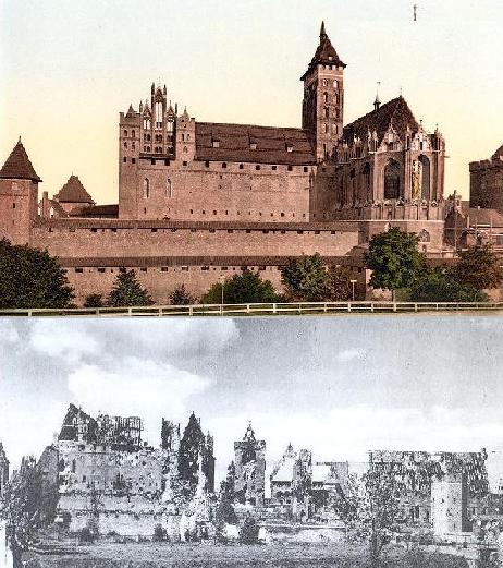 Marienburg castle before and after bombing, below (click to enlarge) |