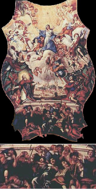 Above left: The year that the Protestants were driven out, the jubilant Catholic authority commissioned the building of the pilgrimage church of Maria Kunterweg. The painted ceiling of the church shows 14 local Protestants on the bottom getting their punishment from God (click to enlarge). Despite these intense measures, it was not until a parish report from the year 1788 that it was confidently stated that "the erring faith" was finally eliminated. |