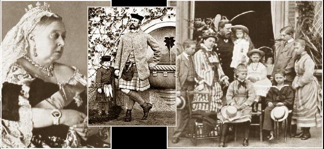 Above left, London Queen Victoria in 1858. Center, Friedrich visiting Balmoral Right, the Crown Prince and the British Queen's daughter Vicki and their family 1875 |