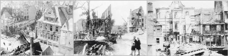 | One survivor described the scene: The earth trembled, as if the whole city would be crushed. Dust and blasting clouds swirl and burst darkened the sky, walls, roof trusses were cut open, debris flying high in the air. Eerie small stones and clods of earth rained down on surrounding homes. The first wave was over. A brief respite. Then all hell breaks loose again. A rumble of giants such as drums, deafening and painful. The air shocks are horrible. Once a quiet moment - until the next carpet bombing. It is followed by several minutes, which are full of the hideous circles of invisible bombers. Then just one explosion after another. The shattering blows unheeded. The roar subsides. Only thirteen minutes have passed - an eternity for all who had to live through it.. The 43 enemy bombers have turned over and removed themselves. Because of the lack of good visibility, the "marshalling yards" by Olpe - supposedly the real target - are still intact. Their bombs had missed their target? The only result of their attack to register the squadron commanders the huge mushroom that breaks through the clouds at 3000 meters. The inferno from this surprise attack triggers gruesome scenes, in the houses, in the bunkers. Some the fear of death has made mad. Others pray quietly to themselves. Only a few are brave enough to go against the general excitement, to tidy up the mess and prevent outbreaks of panic. The twon center shows great devastation. Windows, doors and solid walls were dented or torn out.. Ceilings have fallen, smashed furniture and household items. . Trees were uprooted and torn, bent poles. . For miles around, there is no visibility. Supply cables and telephone lines were gone. Everywhere death has harvested: under collapsing walls, inside burning buildings, on the way to the protective bunkers. Most people were exposed to the attack in the open air. Some were later struck down by time fuse bombs, shredded by shrapnel, killed by air pressure. In long rows of people lying moaning in the hallways of the hospital and the Upper Secondary School, because the space in the hospitals are no longer sufficient, many naked on the floor. At least 80 are seriously injured. The School is the center of terror and indescribable misery No fire water flows from the hydrants to fight the fires. It must be pumped from the mill trench. At about 12:30 clock, roars up low altitude fighter-bombers who fire from their guns and these machines dropped bombs with phosphorous munitions that kindled more fires in different places. Extreme heat also radiates the now burning Holterhoff fashion store, where plenty of food materials are stored. Soon the fires are in all corners of alarming proportions. The glow begins to heat the air much. Walls collapse. A shower of sparks rained out on the fire teams, often blocked on their the way to the fires by wreckage. While working in the hard-hit streets, fire and rescue crews have to duck for cover from two or three fighter-bombers who circle above the city for seven minutes, hindering the rescue work by firing guns, finally dropping eight bombs on the barracks of the Russian camp. A small group of people escaped and, like rats, scurried through deserted houses stealing what the bombs have spared been spared. Even before the dead bodies are not spared the shameless behavior of these looters and grave robbers is one of the almost incomprehensible events of that day. |