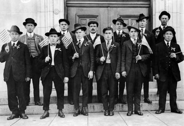 | The 11 men who were accused of killing Robert Paul Prager. They went on trial in the Madison County Courthouse in Edwardsville on May 28, 1918. The jury acquitted them after 45 minutes of deliberation on June 1. They are shown here in front of the courthouse on May 15 as jury selection began. At far left in front is Wesley Beaver, who also was accused of helping to drag Prager from a hiding place in Collinsville City Hall on the night of the lynching. Second from left in back row is Joseph Riegel, alleged ringleader. At far right in the back is their escort, sheriff's deputy Vernon Coons. Seven months after the verdict, a guilt-ridden Beaver killed himself. (Post-Dispatch) |