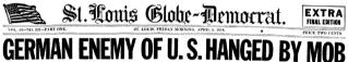 | Chicago Daily Tribune. April 5, 1918 EXTRA - ILLINOISAN LYNCHED FOR DISLOYALTY Collinsville, Ill. - April 5, 2 a.m. [By the Associated Press.] - Robert P. Praeger, said to be of German parentage, was hanged to a tree one mile south of the city limits here after midnight by a mob of 350 persons. The mob dragged Praeger from the basement of city hall, here he had been hiding. Praeger was accused on making disloyal remarks in a speech he made recently to miners in Maryville, Ill. Forced to Kiss the Flag Praeger early in the night was taken in hand by members of the local loyalist committee and forced to parade barefooted through the streets kissing the American flag at intervals. The police rescued him and took him to the city hall for safekeeping. Later in the night a crowd gathered in front of the hall and demanded Praeger be surrendered to them. Mayor Siegel appeared on the steps and counseled calmness, but the demands increased and the police then took Praeger to the basement, where he was concealed beneath a pile of tiling. Led with Rope on Neck When the demonstrants discovered the man was not to be delivered to them they rushed past a corden of officers and after a short search dragged Praeger from hiding. Barefooted he was led through the streets at the end of a rope and later was hanged. One of the mob is said to have shouted to the police as the party and prisoner passed down the street: "In the morning you will find the body hanging to one of the telegraph poles on the Rock road." The local police issued a statement late last night in which they said Praeger denied that he was disloyal. He admitted he was born in Germany but that he had his first naturalization papers and intended to become an American citizen. Collinsville is a city of 4,000 population twenty miles east of St. Louis. (click on images below) |