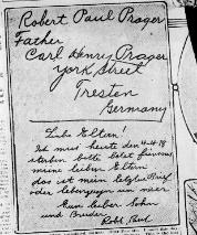 | "Dear Parents- I must this day, the 5th of April, die. Please pray for me, my dear parents." Robert Prager in a letter written to his parents before he was hanged, 1918 |