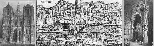 | A city important to Protestant history is Regensburg, also known as Ratisbon. It is one of the oldest German cities and a cultural center with historic monuments dating back to Celtic times. It was an important Roman outpost known as Castra Regina. An abbey was founded there in the mid 7th century, and St. Boniface established an Episcopal See in 739. Regensburg has a long history of negotiation and arbitration. For example, it was at the Council of Ratisbon in the year 742 that the first officially authorized the use of chaplains for armies was granted, but it prohibited the "servants of God" from bearing arms and fighting. The word chaplain itself dates from this period. Regensburg was captured by Charlemagne in 788 when he subjugated Bavaria. One of the most prosperous commercial centers of medieval Germany, Regenburg traded as far as India and the Middle East. The city proper of Regensburg was made a free imperial city in 1245, and accepted the Reformation in the 16th century, but was influenced by the Counter Reformation in the late 16th century. In the Thirty Years War Regensburg was garrisoned by Bavarian troops and was bombarded and captured by the Protestant general Bernhard of Saxe-Weimar in 1633, then recovered by imperial forces under Ferdinand III. From 1532, Regensburg was often the meeting place of the Imperial Diet, and it became the permanent seat of the Perpetual Diet or Immerwährender Reichstag, around 1663, around the time its commerce had declined. Under the influence of Napoleon, the diet was completely reorganized from the Holy Roman Empire from 1801 to 1803. In April of 1809, Napoleon Bonaparte was wounded scaling the town walls with ladders during a battle. The Bishopric of Regensburg and the city along with Aschaffenburg were given to K. T. von Dalberg, and Regensburg and became the capital of the Upper Palatinate in 1810 under Bavarian rule. Many people went to Regensburg to plead assorted legal cases. Astronomer Johannes Kepler died in the Golden Cross Lodging House in the city after having gone there to collect a debt in 1630. Another momentous event occurred at the Golden Cross when Holy Roman Emperor Karl V (King Carlos I of Spain) spent the summer of 1546 there and met a beautiful young girl named Barbara Blomberg, the daughter of a local craftsman. It developed into a passionate but short romance. An illegitimate son of this union was born in Regensburg under complete secrecy in 1547, and was separated from the mother and taken to Spain to be reared. The bastard Juan had an exciting life. He was raised as "Gerónimo" in Spain, and in respect of his father's will he was recognized by his legitimate half brother, Philip II of Spain, and given an income and the title of Don Juan of Austria. Philip hoped Juan would enter the Church, but Juan wanted the military career at which he later succeeded rather brilliantly. He fought pirates, various rebels and the Ottomans, defeating the Turks at in the Battle of Lepanto in 1571. At one point, Juan had even planned to liberate Mary Queen of Scots from her English captivity and marry her. He died of typhus. Unlike the other medieval German cities completely flattened by World War Two Allied bombing, many of Regensburg's ancient buildings amazingly survived, including the famous cathedral. However, the 9th century Romanesque church of Obermünster, top of page left, was completely destroyed at the tail end of the War by a totally meaningless bombing in March of 1945. Only the belfry still stood. The church could not be rebuilt. |