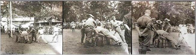 | One Col. William Holmes managed to have "confessions" extracted from four Germans on Rabaul admitting they had become intoxicated and roughed up a Methodist minister they suspected of being a spy. Holmes ordered the Germans to be publicly flogged at Proclamation Square in Rabaul. Natives and women were not allowed to attend. Half a battalion of men was marched to the square and lined up to watch. Before the flogging, the Germans loudly protested their innocence, but it was to no avail. The first German, a medical officer, was placed across a trunk with his hands handcuffed to two tent pegs in the ground while his ankles were chained with leg irons to two pegs on the opposite side of the tree trunk. He was given 30 extremely violent strokes of the cane and carried away. The next man then was similarly lashed across the trunk and given 25 strokes, as was the next. Since the last victim was only a young boy, he received only 10. A new provost was brought on for each caning so one man wouldn't "tire out". After each flogging, the victim was carried away, but not one of them made a sound. Although no photographs were allowed at the flogging, one private hid his camera under his shirt with only the lens popping out, and he managed to catch it on film. |