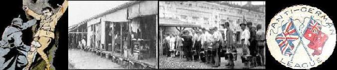 | Canadian towns with German names were renamed. Over 2,000 German immigrants were interned, with 37,000 Albertans alone designated as "enemy aliens." Germans directly from Germany were barred from entry into Canada until 1923. Above: Hun crucifies enemy soldier; Internment camps in Australis and Canada; Pin from the Anti-German League in Australia, 1915 |