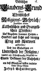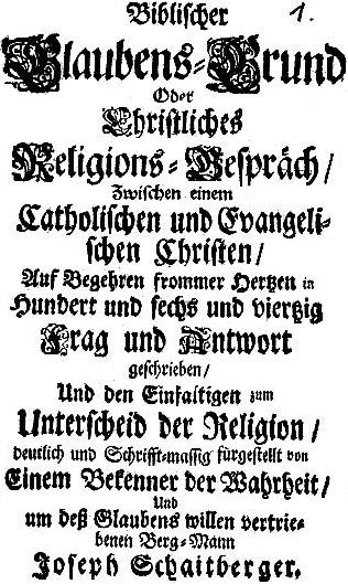 | Biblical grounds of faith or Christian conversation on religion between a Catholic and a Protestant Christian, written as one hundred and forty questions and answers as requested by pious hearts, to present clearly and Scripturally the difference of religion for the simple, by a confessor of the truth, a miner who was banished for the sake of the Gospel, Joseph Schaitberger |