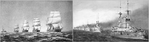 | Left: SMS Falke, SMS Hansa, SMS Kaiser, SMS Kronprinz and SMS König Wilhelm. Right: The World War One era navy |