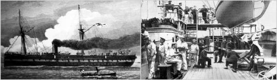| The Panzerfregatte SMS Kaiser, above, was built at Samuda Brothers, London and launched in 1874. She was the lead ship of the Kaiser class armored frigates. The ship was commissioned into the Imperial German Navy on February 13, 1875. Later, SMS KAISER was converted to a large cruiser at the Imperial Shipyard, Wilhelmshaven. In 1889, Kaiser Wilhelm II embarked on a tour of Genoa, Athens, Istanbul and Venice on the ship. The photo on the right is during that tour. After 1894, she served in Asian waters with the Far East Cruiser Division of the Imperial Navy. SMS Kaiser was Rear Admiral Otto von Diederichs’ flagship of the Cruiser Division in East Asia and participated in the amphibious landing during the German acquisition of Kiautschou Bay in northeastern China in November 1897. |
