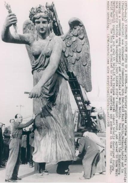 | Ferocious Allied bombs all but destroyed it in the War, and it was derided as a symbol of "Prussian militarism". The communist Soviet flag flew from a flagpole atop the gate from 1945 until 1957, when it was replaced by an East German flag. The goddess was again kidnapped, this time by the communist government of East Germany in 1958, to strip it of the iron cross and the eagle, not wanting to "encourage German nationalism" (click above). Since the reunification of Germany, the flag and the pole have been removed and the iron cross and the eagle replaced. The Brandenburg Gate was more fully restored from 2000 to 2002 |