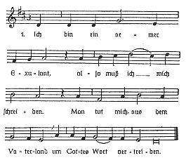 | Ich bin ein armer Exulant, also muss ich mich schreiben. Man tut mich aus dem Vaterland um Gottes Wort vertreiben. Doch weiss ich wohl, Herr Jesu mein, es ist dir auch so gegangen. Jetzt soll ich dein Nachfolger sein; mach´s Herr, nach deinem Verlangen. Ein Pilgrim bin ich auch nunmehr, muss reisen fremde Strassen, drum bitt ich dich, mein Gott und Herr, du wollst mich nicht verlassen. Ach steh mir bei, du starker Gott, dir hab ich mich ergeben, verlass mich nicht in meiner Not, wann´s kosten soll mein Leben. Den Glauben hab ich frei bekennt, des darf ich mich nicht schämen. Ob man mich einen Ketzer nennt und tut mir´s Leben nehmen. Ketten und Banden war mir eine Ehr, um Jesu Willen zu dulden, denn dieses macht die Glaubenslehr und nicht mein bös Verschulden. Ob mir der Satan und die Welt all mein Vermögen rauben, wenn ich nur diesen Schatz behalt: Gott und den rechten Glauben. Herr, wie du willst, ich geb mich drein, bei dir will ich verbleiben. Ich will mich gern dem Willen dein geduldig unterschreiben. Muss ich gleich in das Elend fort, so will ich mich nicht wehren, ich hoffe doch, Gott wird mir dort auch gute Freund bescheren. Nun will ich fort in Gottes Nam´ - alles ist mir genommen, Doch weiss ich schon, die Himmelskron werd ich einmal bekommen. So geh ich heut von meinem Haus, die Kinder muss ich lassen. Mein Gott, das treibt mir Tränen aus, zu wandern fremde Strassen. Ach führ mich Gott in eine Stadt, wo ich dein Wort kann haben, damit will ich mich früh und spat in meinem Herzen laben. Soll ich in diesem Jammertal noch lang in Armut leben, Gott wird mir dort im Himmelssaal eine bessere Wohnung geben. Wer dieses Liedlein hat gemacht der wird hier nicht genennet, des Papstes Lehr hat er veracht und Christus frei bekennet. |