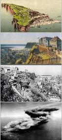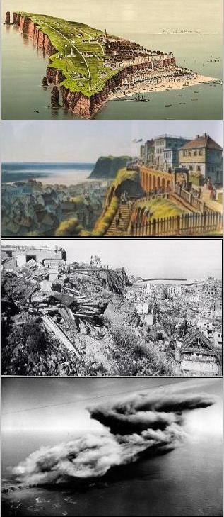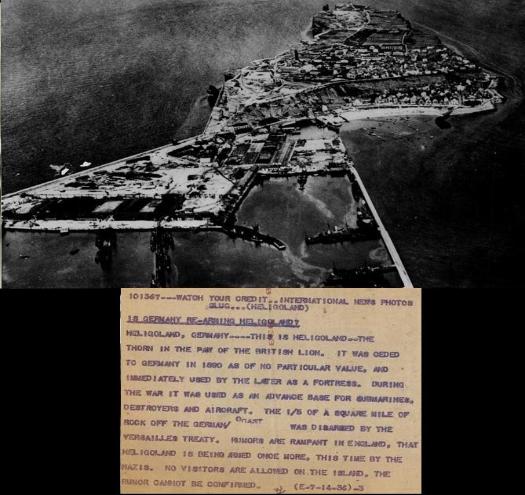 Roman historian Tacitus called the rock formations on Helgoland, an island in the North Sea, "the columns of Hercules". Originally, its large red rock had a mate of white limestone. They stood about a mile apart and were connected by a strip of sand and stones, while another much lower sandy island called ‘Hallem’ stretched below, protected by the ‘Witte Cliff’ against raging north west storms. It is believed that Helgoland was a holy place to the ancient Frisians where they paid homage to Fosetes, the God of justice. In 697 A.D., when Radbod, the last Frisian king, was defeated by the Franks, he withdrew to the island and Christianity was introduced. In 1231, Helgoland belonged to Danish king Waldemar II, and sovereignty of the island changed several times between Denmark and the Duchy of Schleswig with a short marriage to Hanseatic Hamburg (famous pirate Claus Stoertebecker once used the island for a base camp) until 1714, when it remained with Denmark until the English took it by force in 1807 during the Napoleonic war. In 1890, England ceded it to Germany in return for rights to Wituland and Sansibar in Africa. In 1425, companies from Denmark, the Low Countries, and Hamburg and Bremen operated on Helgoland for the large quantities of herring, but the fish swam away in the early 1500s and the island faced an era of epidemics around 1550. The people faced starvation for some time, and beginning then, ‘Witte Cliff’ (white cliff) was broken down bit by bit and sold as chalk. The entire white rock disappeared, as did the connecting strip while a violent storm pounded the island in 1721. By then fishing was again the main occupation. In 1807, the British captured Helgoland for the English crown. Cut off from normal trade by Napoleon's blockade, Britain used the island's resources to feed the British public. Once the war was over, the markets for fish was lost and so was the island's economy, until a boat builder named Jacob Siemens established a sea-side resort on the island for tourists, providing a new source of income. After England ceded the island to Germany in July 1890, a naval base was created on the island. In 1914, when World War I broke out, the new fortress and a large harbor were completed, and it provided extra prosperity to the natives. During the war the entire population was moved to the mainland, but returned in 1918. The fortress Helgoland was demolished per dictates of Versailles. During World War Two, the British set their sights on the island early on, as the 1936 wire service photo (below right) indicates. On September 29, 1939, six British planes attacked a German naval squadron near Heligoland. The very first bomb the British dropped on German soil was on Helgoland on December 3, 1939, the British claiming to the public it was by mistake. A few days later, on December 14, 1939, twelve RAF bombers attacked German ships in Helgoland, now claiming it was a heavily fortified fortress. Note the 1936 and 1939 wire service photos below and how the vague rationale behind the destruction escalated from a rumor in 1936 to a justification (after the fact) in 1939. (click) |